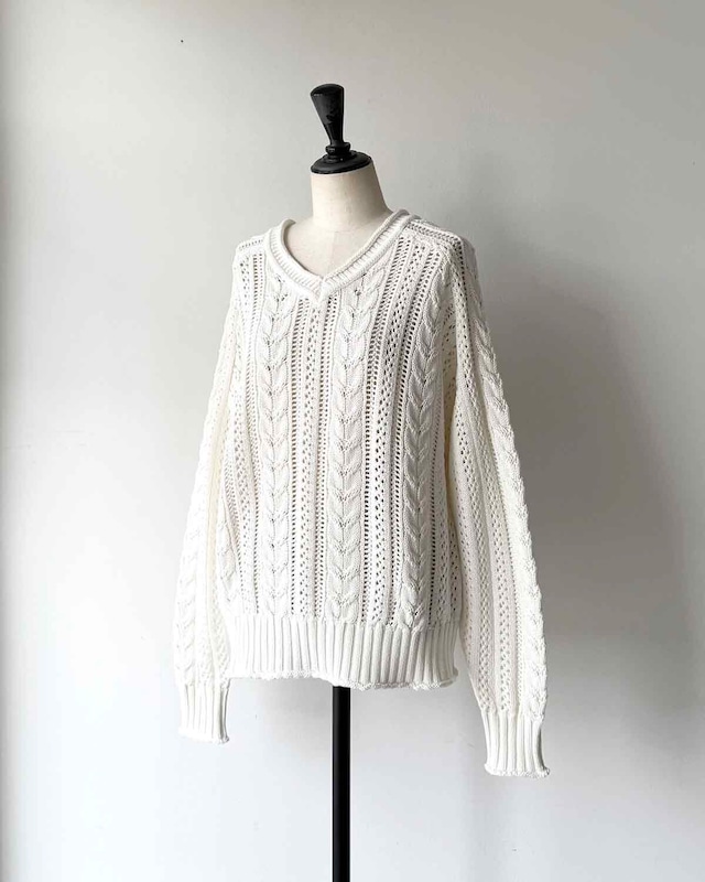 シャリ感のあるコットン糸を使用した、透かしケーブル編みのデザインニット。平らなテープ状になった形状の糸が特徴です。オリジナルの透かしケーブル柄は、着るだけで華やぐ一枚。襟ぐりや袖口、裾がくるんとロールしていたり、細部まで拘りが詰まったデザインもポイントです。体が泳ぐサイジングが、リラックス感のあるシルエットで柔らかい女性らしい印象に。エフォートレスなイージーパンツや、スカート合わせなど、幅広くコーディネートできるアイテムです。 カラー:ホワイト サイズ:2 バスト114cm 着丈 62cm 裄丈86cm 素材: コットン 80% ナイロン 20%