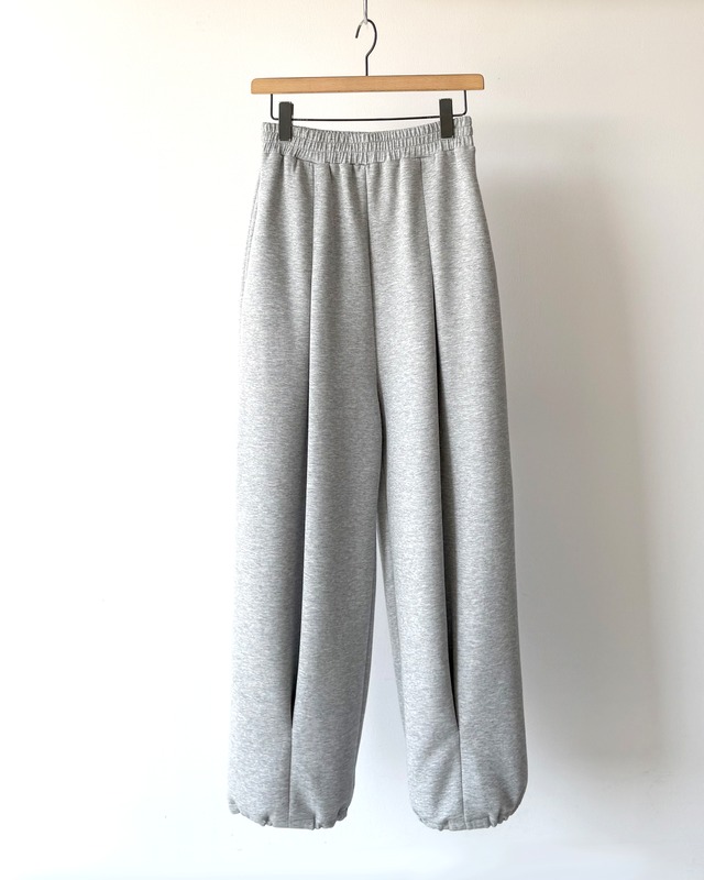 裾絞りのデザインとタックが施されたこのイージーパンツ。 柔らかくなめらか、ハリ感がのあるボンディングの様な素材で、美しいシルエットをキープしながらも快適な穿き心地を実現。 ウエストと裾のタックデザインで、メリハリがあるシルエット。 しっかりとした生地感ながらも柔らかな着心地で、キレイめアイテムとのMIXスタイルやデイリーカジュアルにぴったりのアイテムです。 裾の絞り加減はお好みで調整していただけます。 カラー:杢グレー サイズ:38 FREE 股下66㎝ ウエストゴム仕様 素材:ポリエステル52%・綿39%・ポリウレタン9% 手洗い可