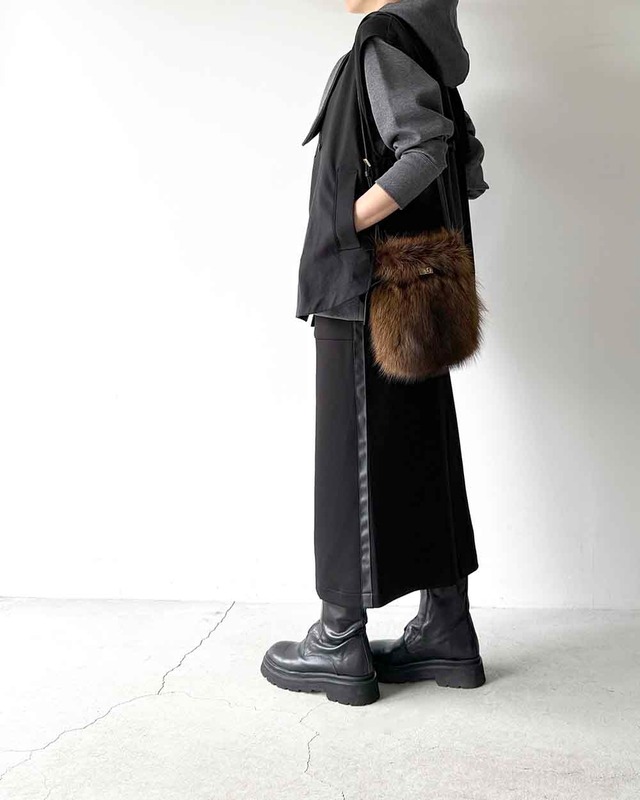 ハリケーンプリーツという変則的な消しプリーツ加工を贅沢にも3段使用した特別感のあるプリーツスカート。まるでヴィンテージレザーのようなウェットで艶の出る加工を施したドレープ性のあるポリエステル素材を使用。動くたび細やかな波のような揺れ感を演出します。ウエストは総ゴム仕様でワンステップで着脱が可能。一段目にはオーガンジーをドッキングしさりげない軽さで、レザーライクでもハードにならない柔らかさをもたらします。 カラー:ブラウン/キャメル サイズ:38(FREE) 総丈92㎝ ウエスト 65㎝ (総ゴム) ヒップ110㎝ 混率: 表地:ポリエステル 100% オーガンジー:ナイロン 50% ポリエステル 50% 裏地:ポリエステル 100% 裏地:有り ポケット:無し ケア方法:ドライクリーニング