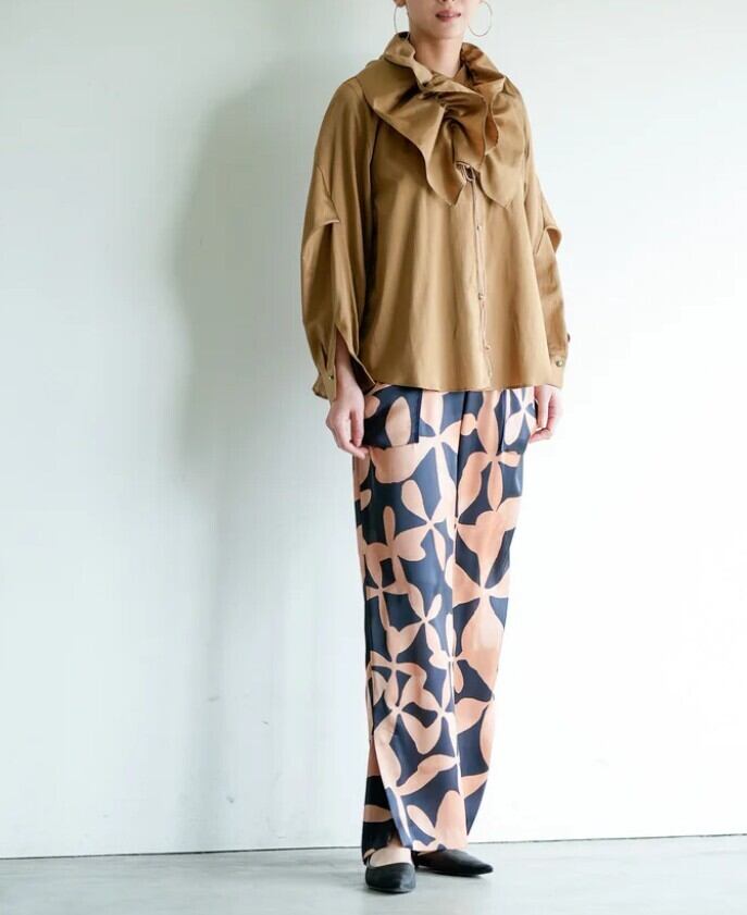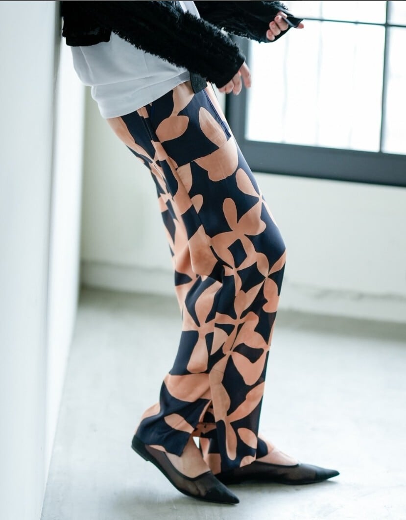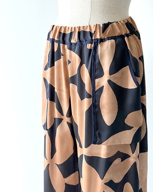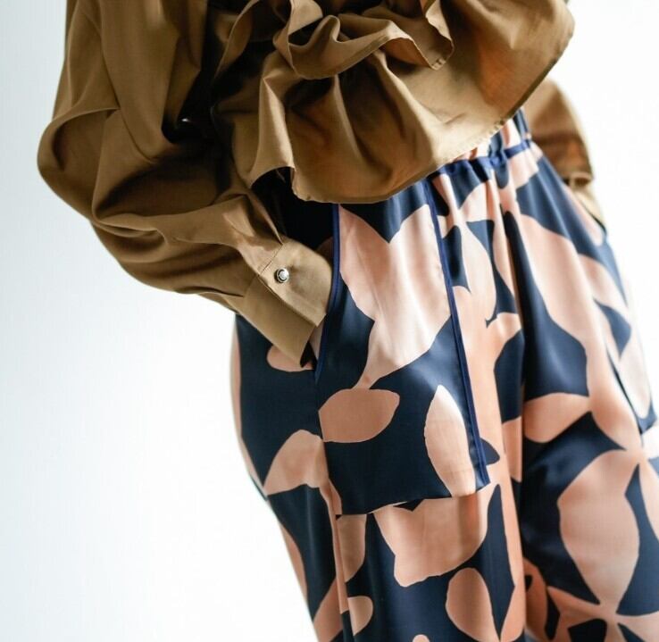 単調な柄の連続の中にリズムを感じるモダンアートのようなサテンパンツ。華やかながらも落ち着いた大人の印象を感じるフラワープリント。水彩画のようなムラ感のあるプリントが薄手の生地に表情を与え、サテンの光沢感で着こなしをクラスアップさせてくれます。しなやかな落ち感で広がらない美しいストレートシルエットには美脚効果が。ウエストは総ゴム仕様でワンステップで着脱することができ、リラックスした穿き心地です。ヒップにはダブルポケットが付き薄手ながらインナーの響きを気にせず着用いただけます。モモはりもカバーしてくれる大きめのアウトポケットにはカラーパイピングを施しさりげないアクセントに。スタイリング次第でカジュアルからきれいめまで幅広く着こなせる一本です。