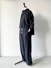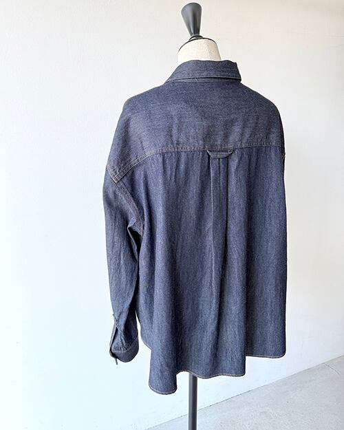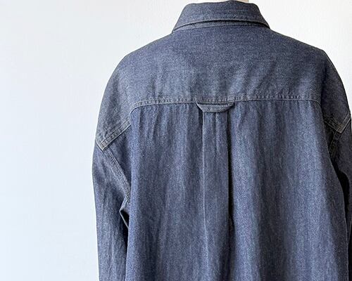 バックはやや短めのレギュラー丈くらい、テントライン状に裾にかけてフレアがかったシルエットなので、手持ちのデニムシャツにない新鮮なアイテムになっています。