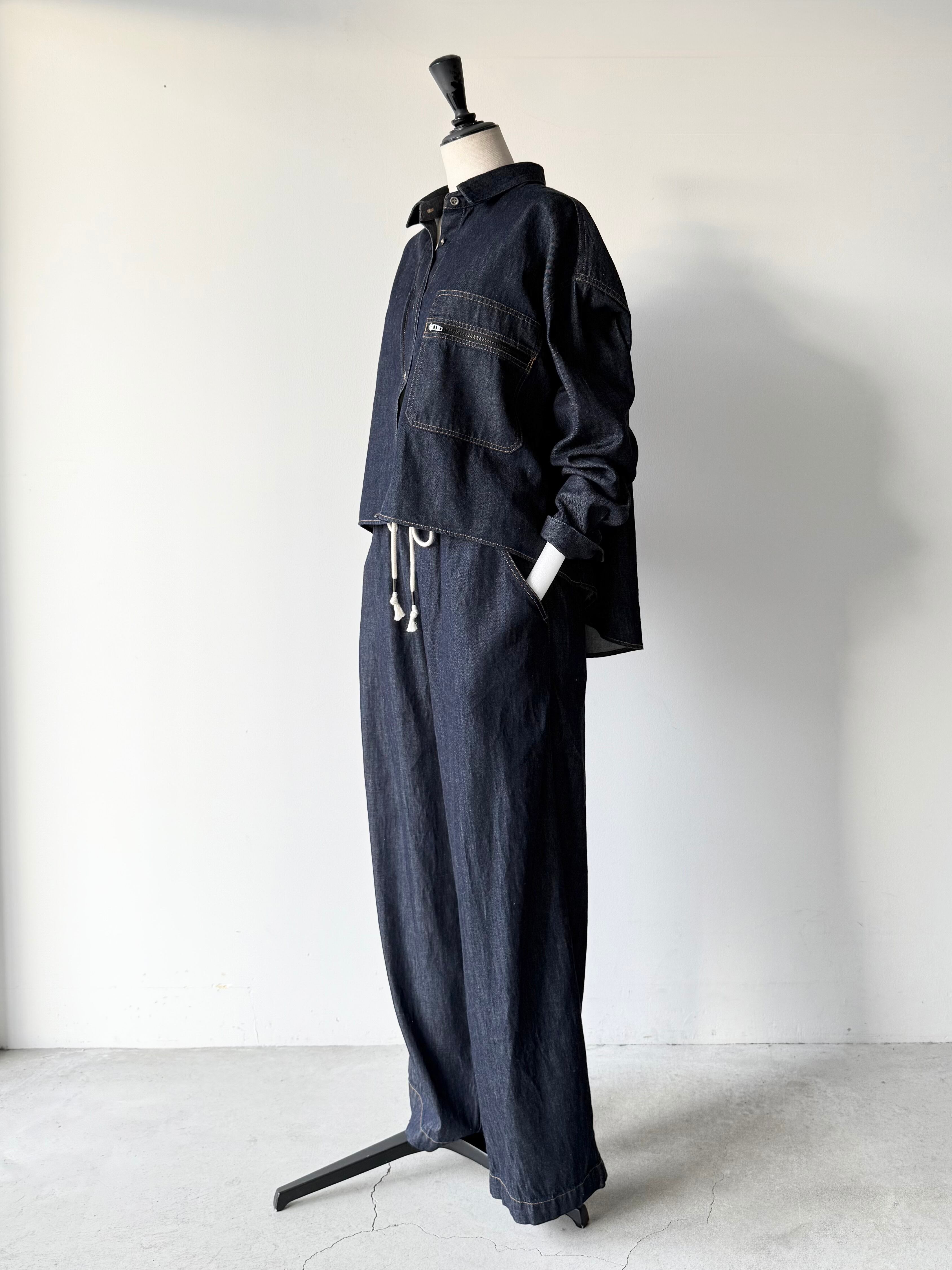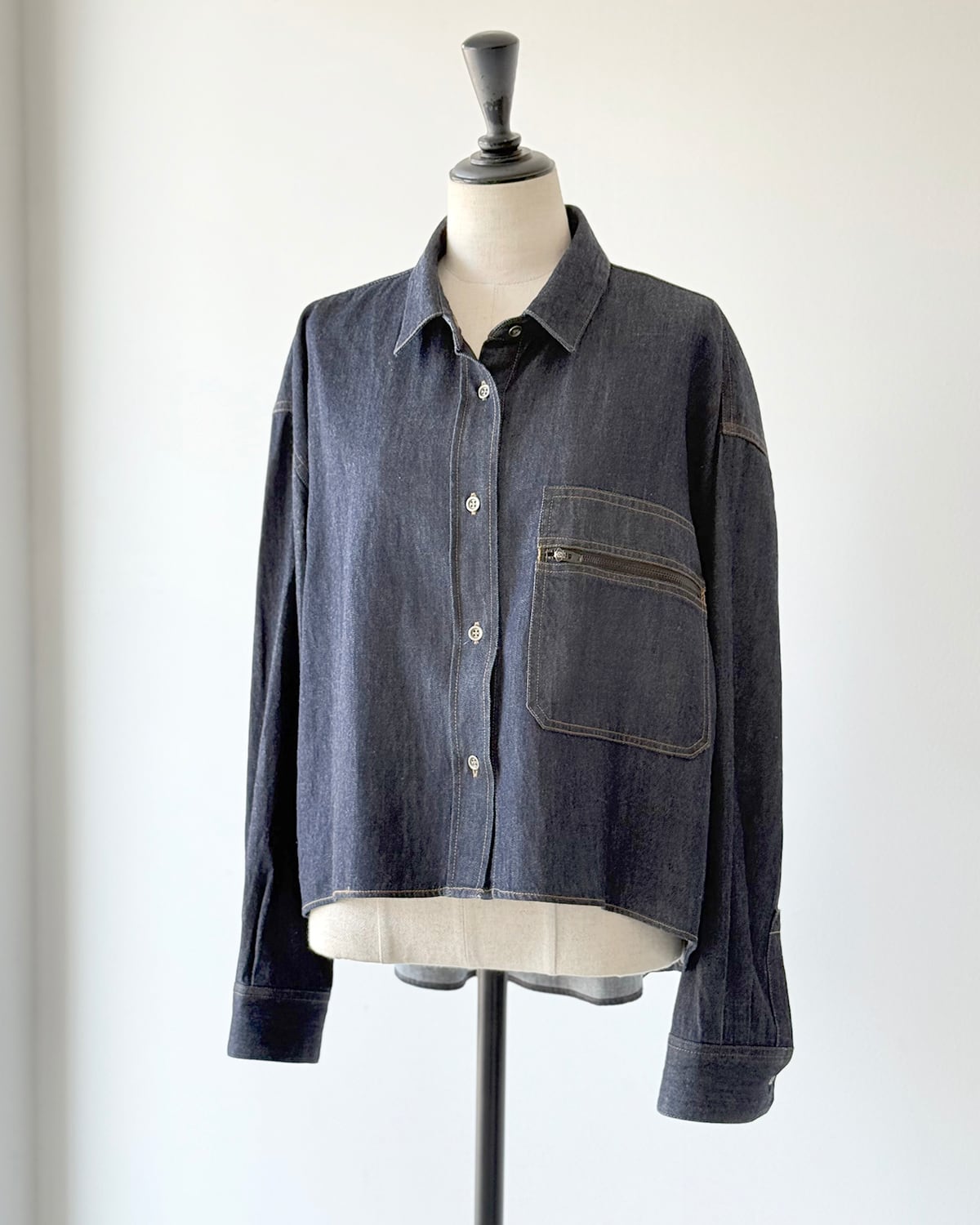 丈の前後差を14cmと大きくつけたデニムシャツで、フロントはショートレングス、