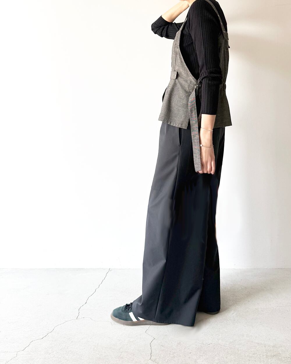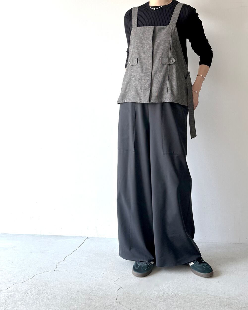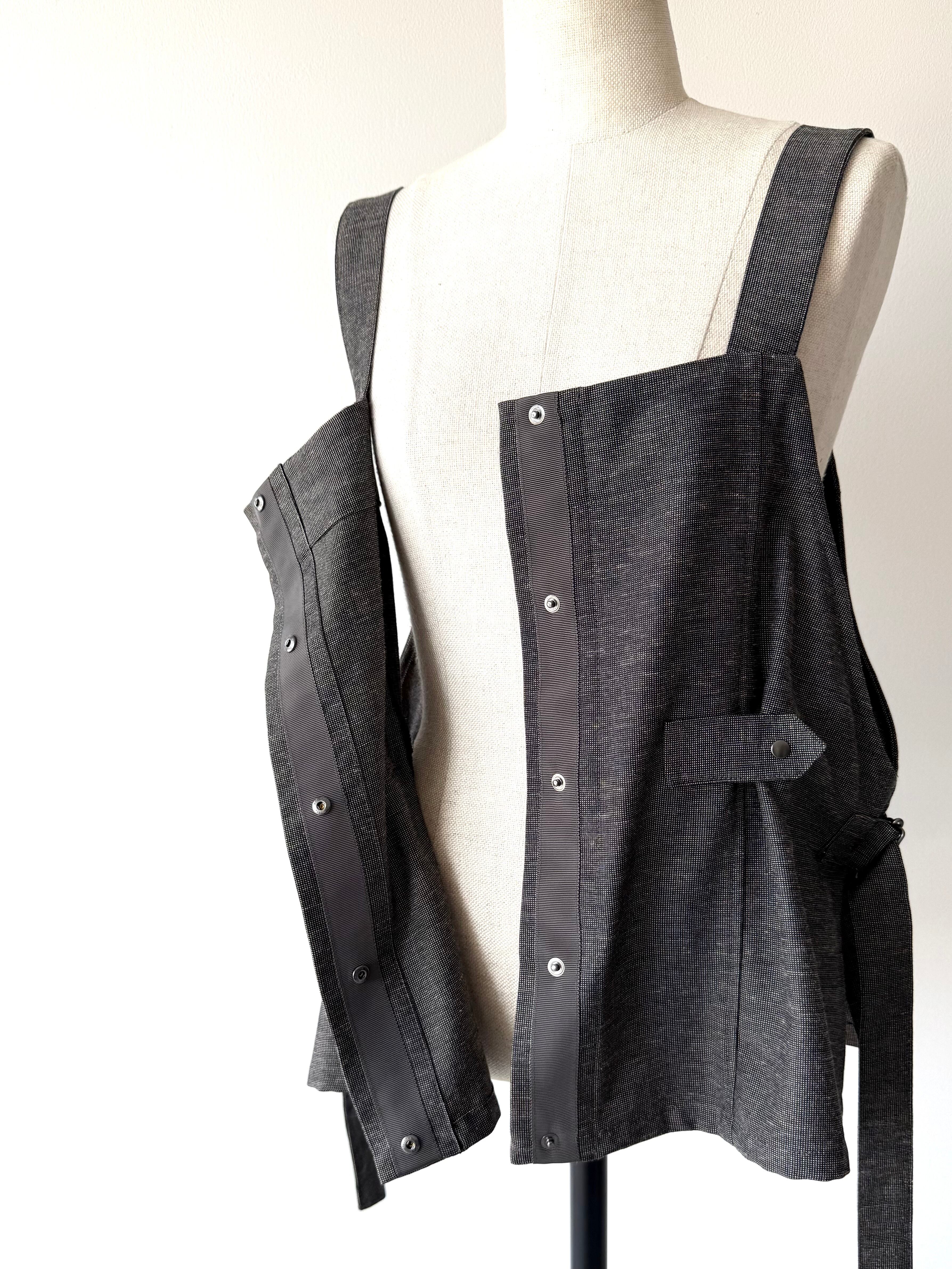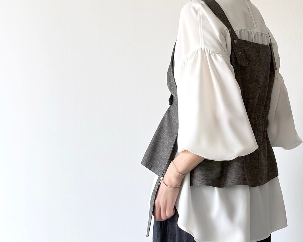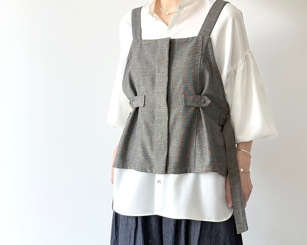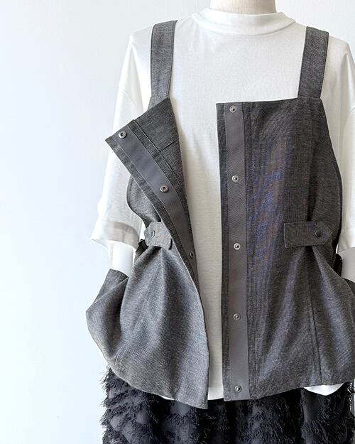 ビスチェのようにも使えるワークベスト。リサイクルポリエステルにレーヨンのしなやかさとリネンの風合いを活かした上質な素材を使用しています。シワになりにくく、さらっとした軽い着心地が特徴です。ワイドのワークベストはそのままカジュアルに着用するのはもちろん、前シームポケットのタブを縮め、後ろウエストのベルトを引っ張り縮めることで、ビスチェのようにも着て頂ける2WAYアイテムです。フロントは隠しドット釦の仕様になっており、前を開けて着用することもできます。ご自宅でお洗濯可能。