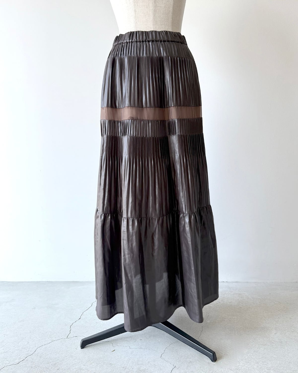 ハリケーンプリーツという変則的な消しプリーツ加工を贅沢にも3段使用した特別感のあるプリーツスカート。まるでヴィンテージレザーのようなウェットで艶の出る加工を施したドレープ性のあるポリエステル素材を使用。動くたび細やかな波のような揺れ感を演出します。ウエストは総ゴム仕様でワンステップで着脱が可能。一段目にはオーガンジーをドッキングしさりげない軽さで、レザーライクでもハードにならない柔らかさをもたらします。