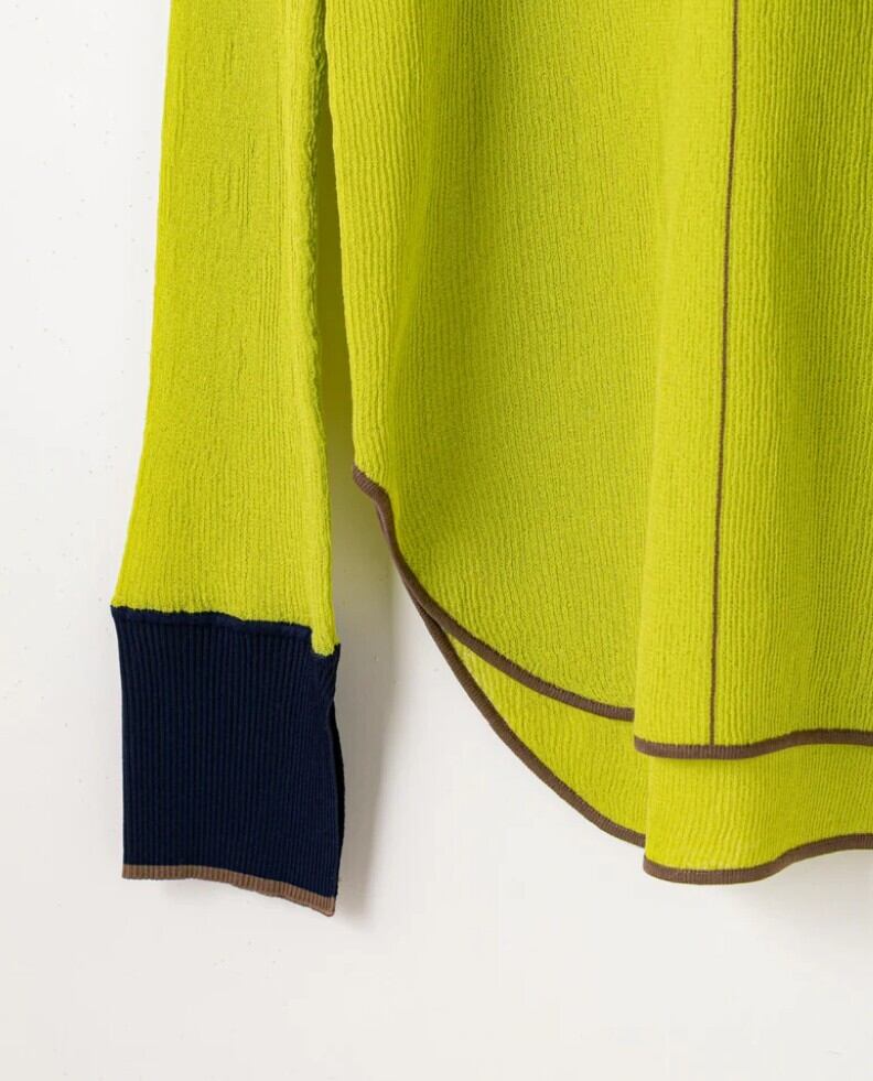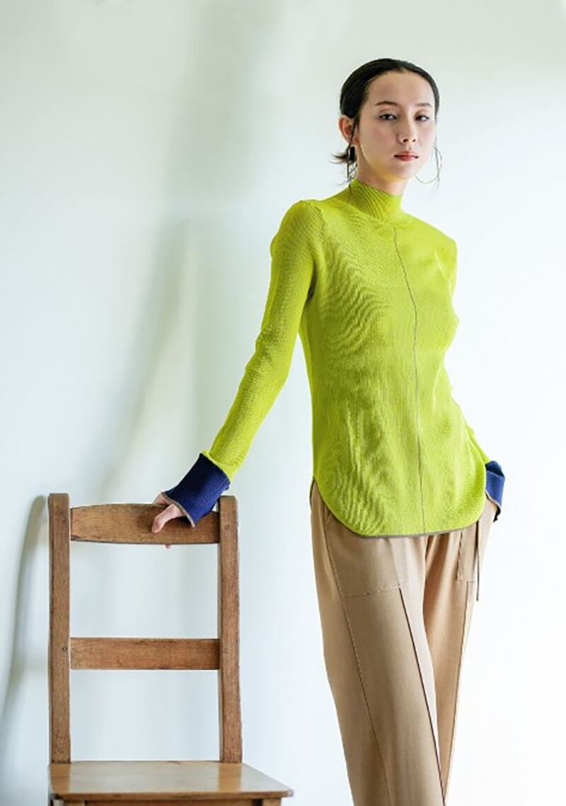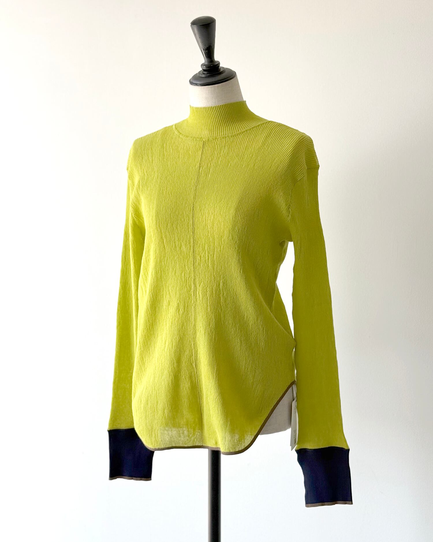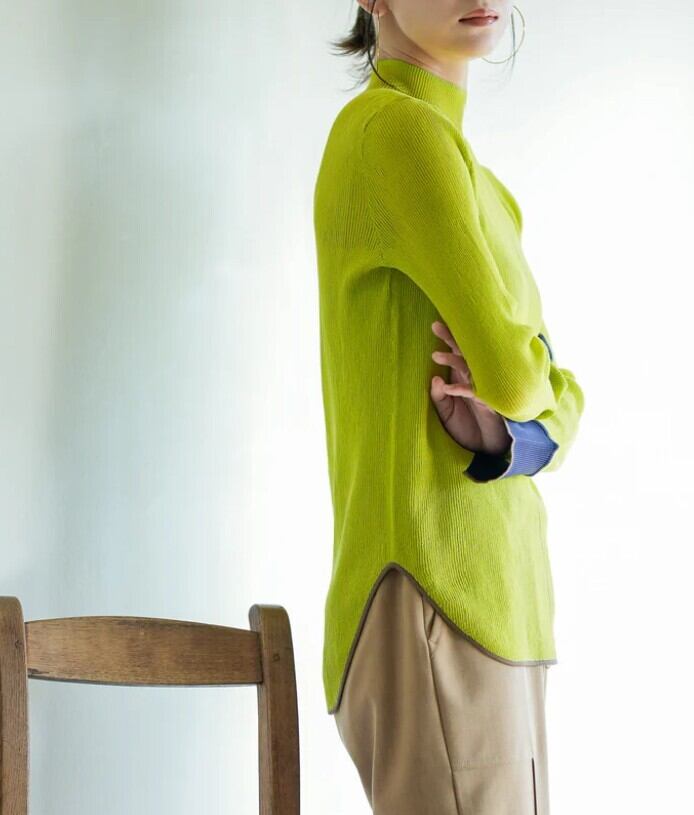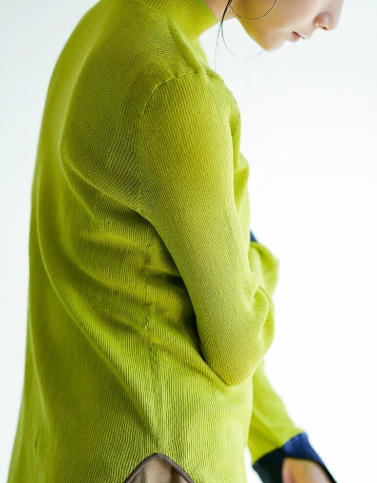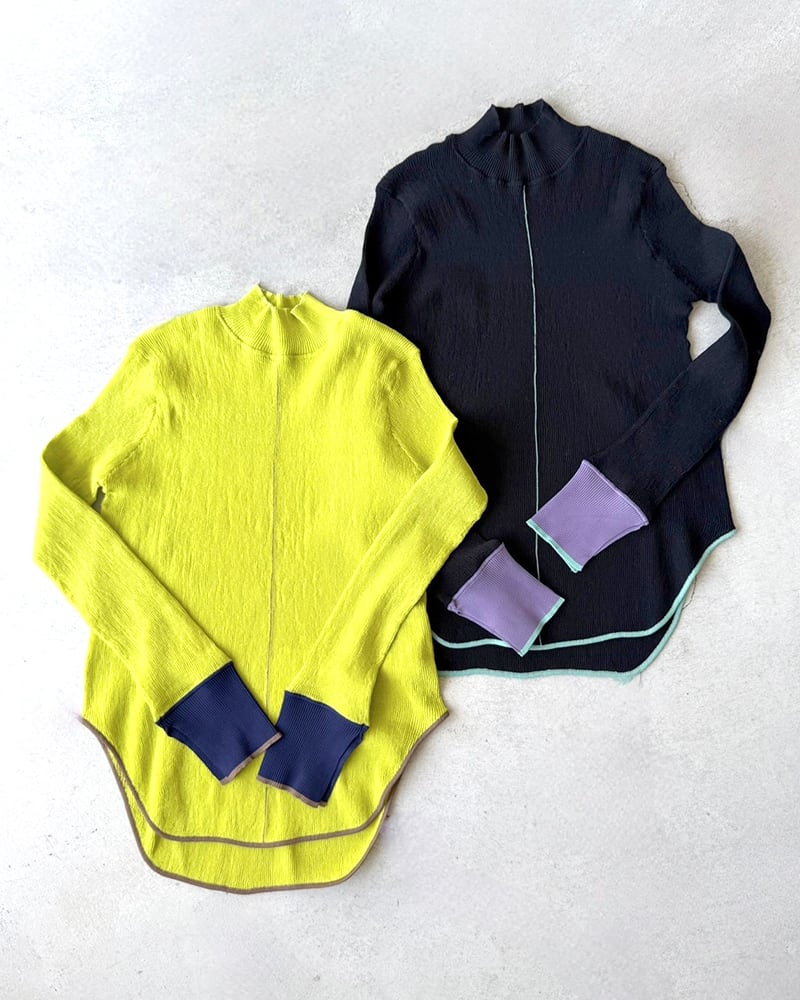 細かいプリーツリブのシアーニット。インナーとして着用した時に覗く部分がさりげないアクセントポイントとなるよう、胸元、手元に異なるカラーが見えるデザインになっています。