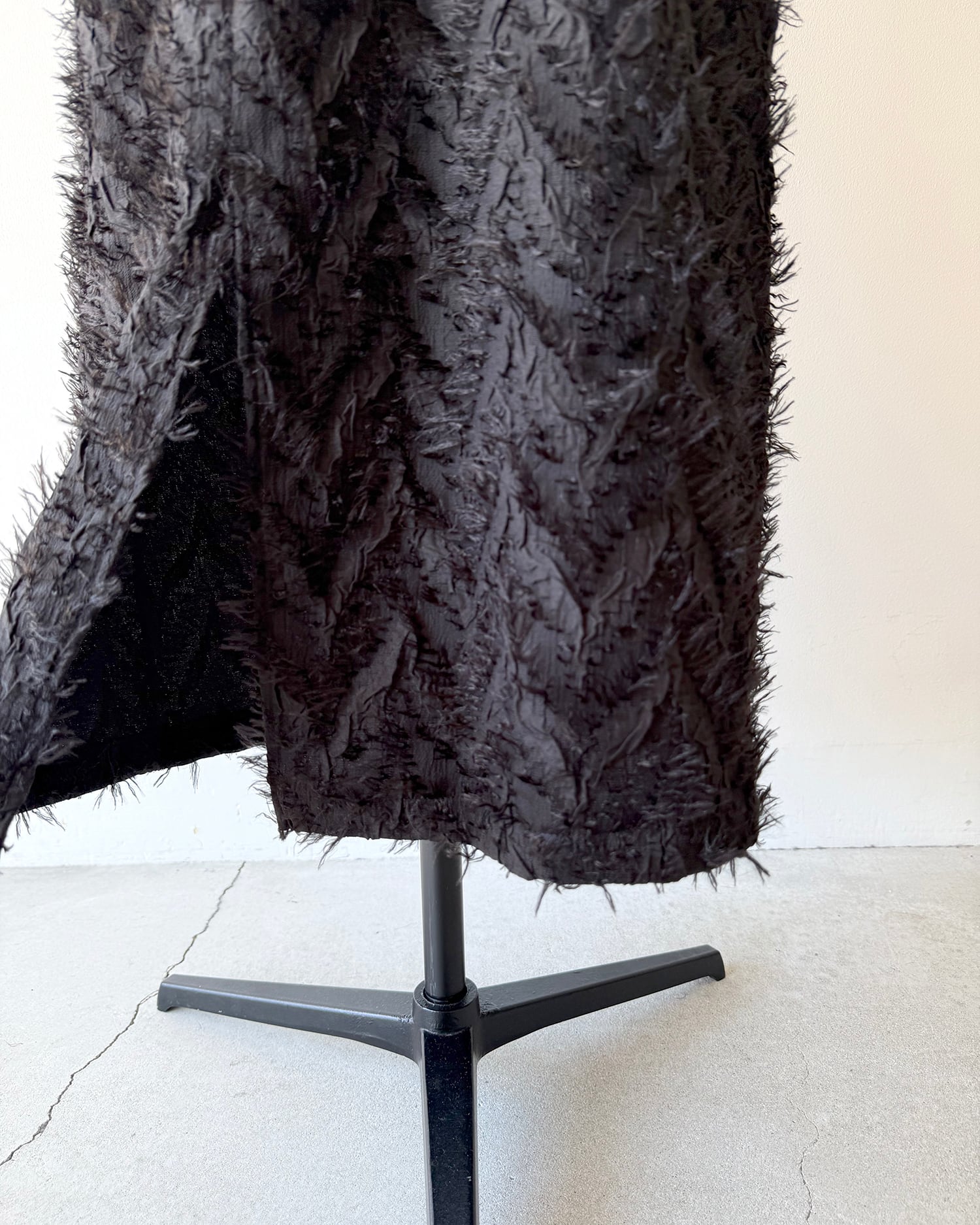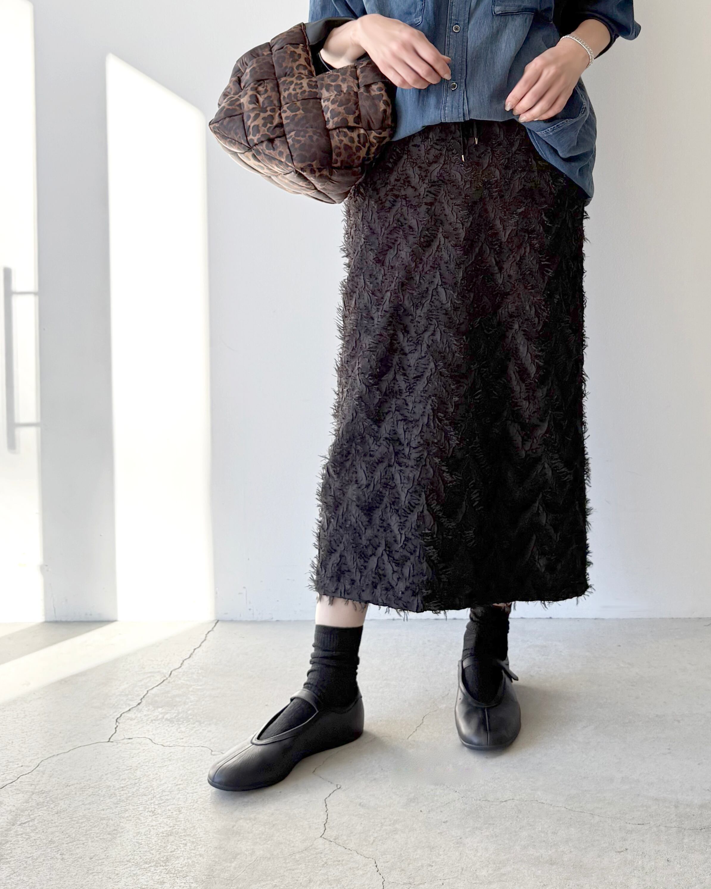 フリンジのテクスチャーが面白いジャガード素材を使ったシンプルなスカート。