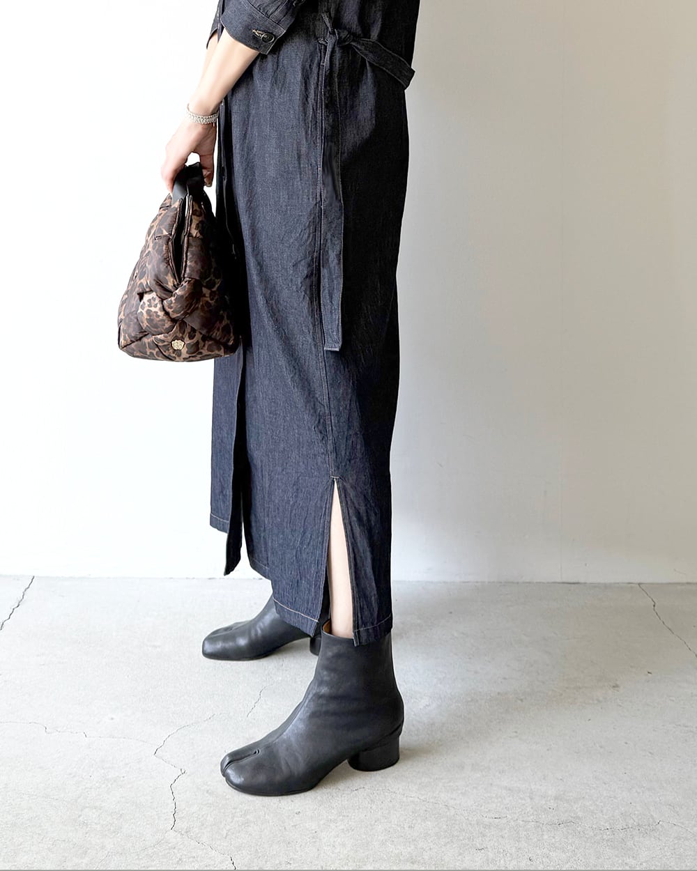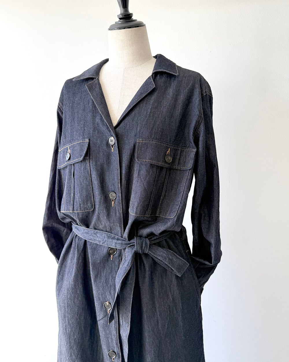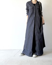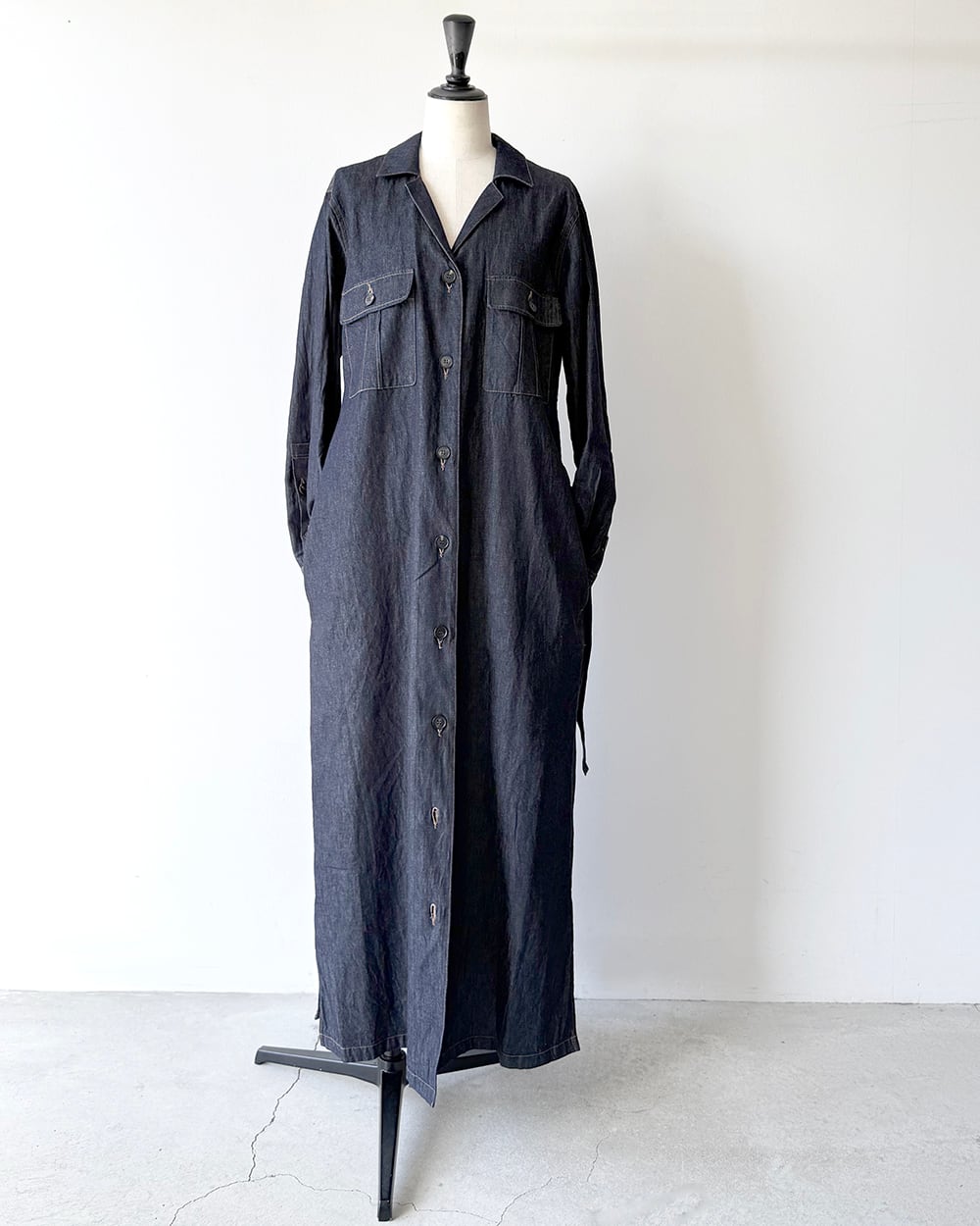 ブラック、モカとも硫化染色のためインディゴ同様に色落ちしていくので、表情変化が楽しめます。ワークシャツをベースにナローなオープンカラーや大き目のボタン使いでアレンジを加えてレディな雰囲気にまとめています。