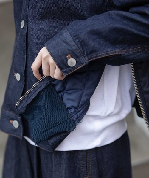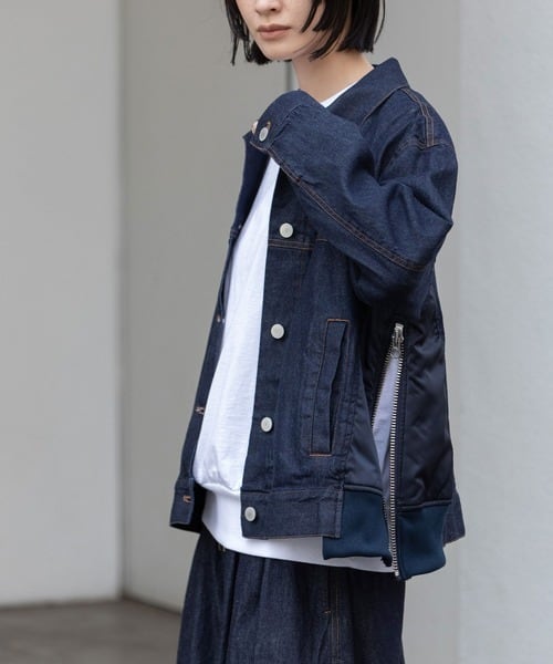デニムトラッカーの脇身頃をフライトジャケットで切り替えたドッキングブルゾンです。
