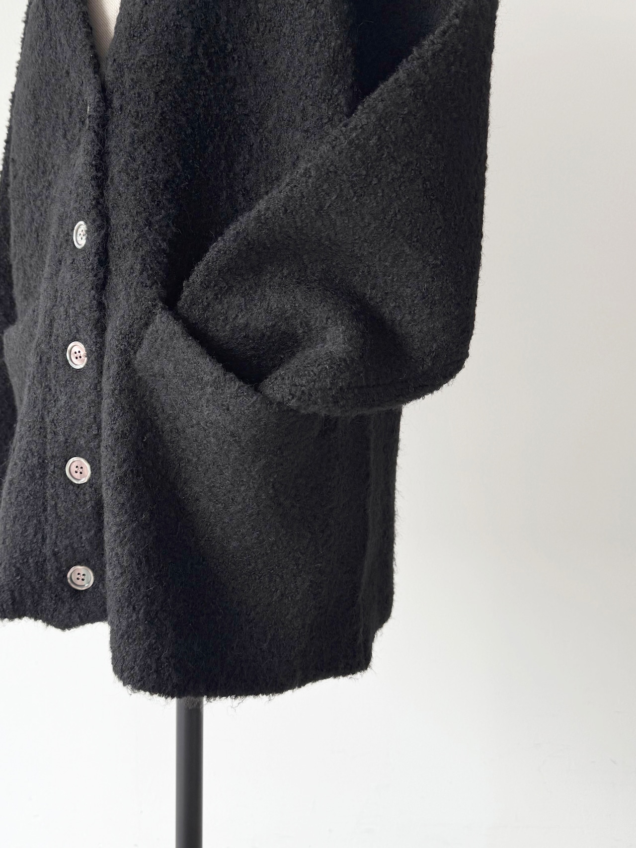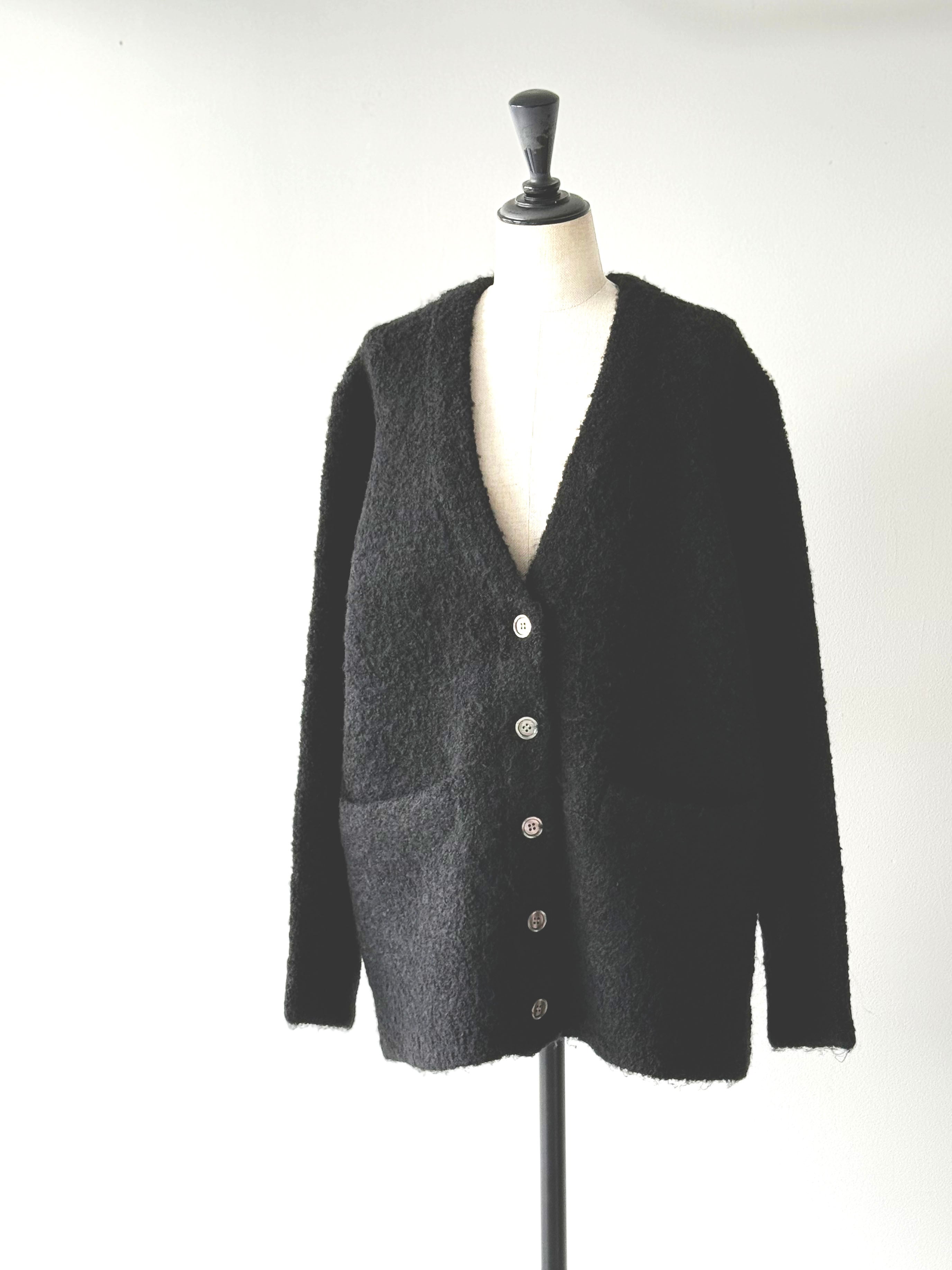 ムートンのような雰囲気のニットカーディガン。ふんわりとした起毛感が心地よい、あたたかみのあるニットトップス。