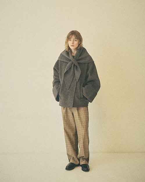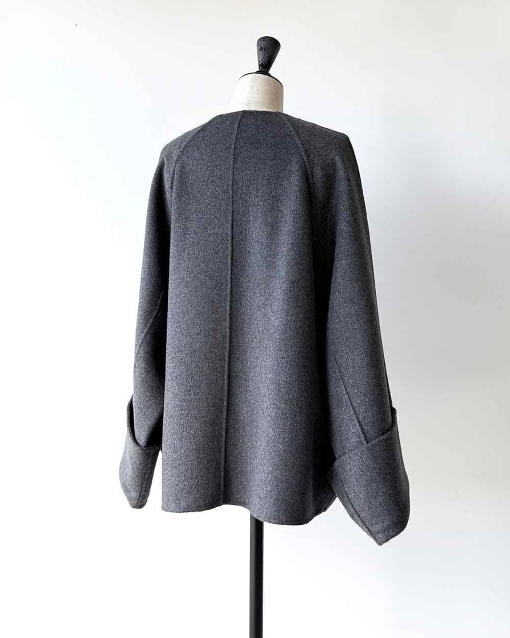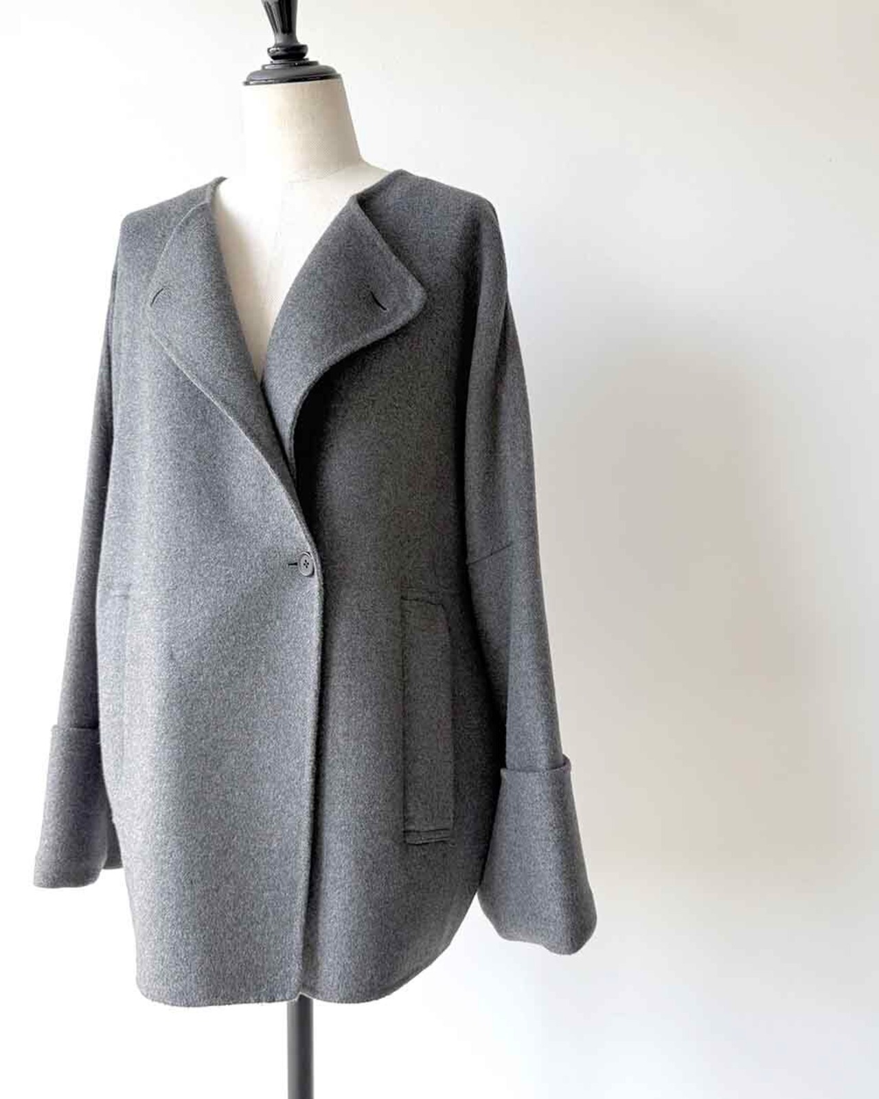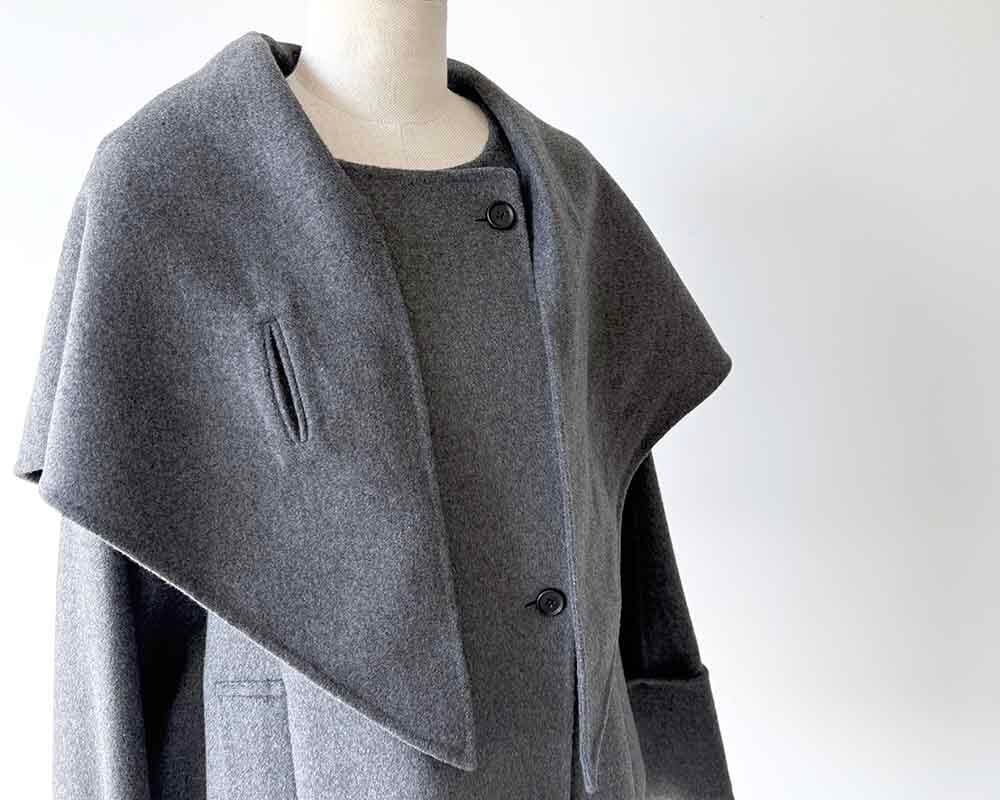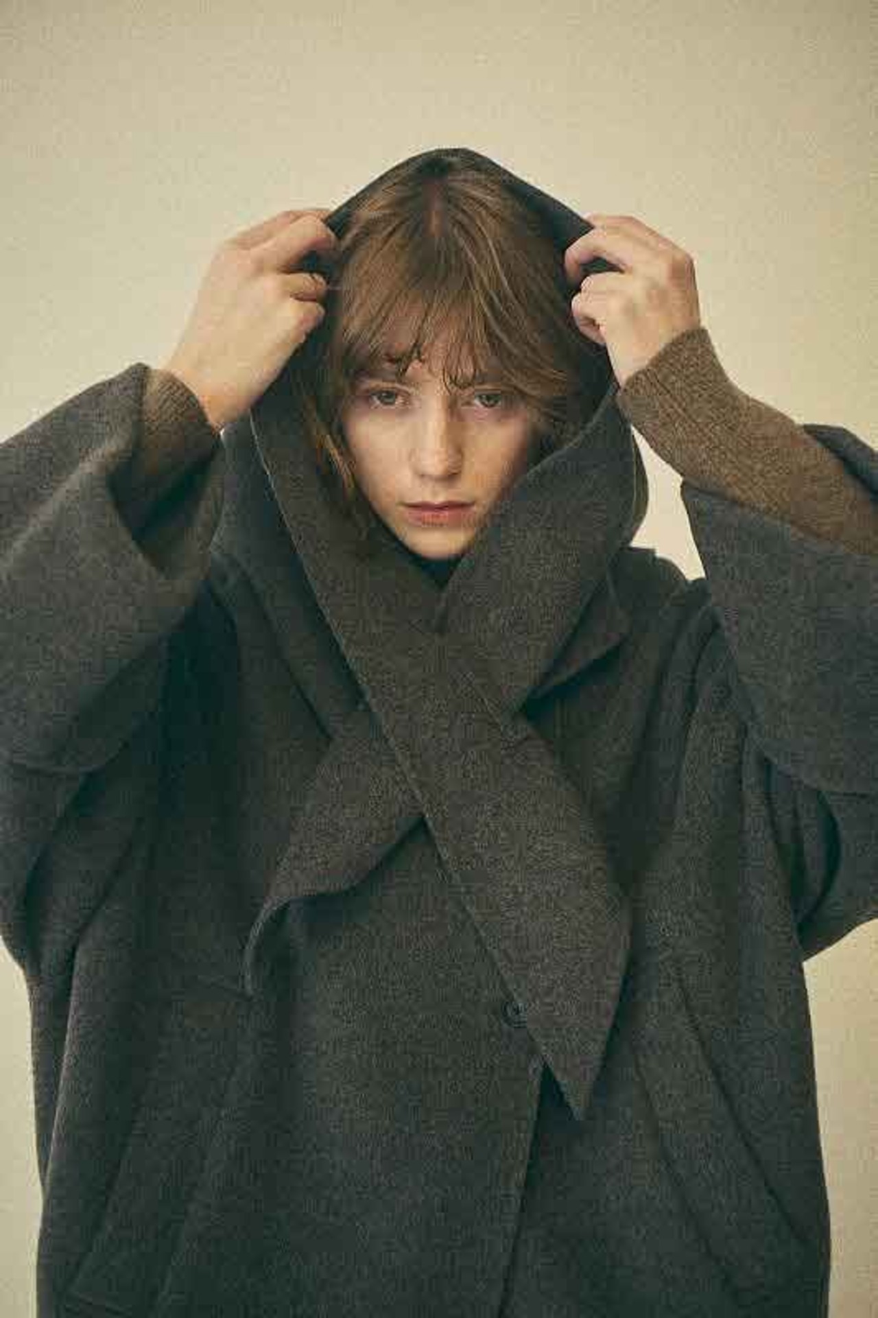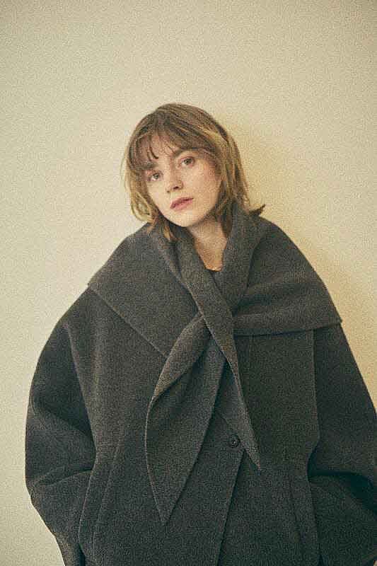 同素材の三角ストール付きのリバー仕立てのドルマンコート。素材には、ダブルフェイスのウール混を使用。ダブルフェイスとは、裏と表の両面が"表地"として仕立てられており、どちらも滑らかで柔らかい上質な質感が特徴です。また断熱性が高く、軽量でありながら温かさを保ちます。すっきりとしたノーカラーにストールを巻くことでがらっと印象を変えられるデザインです。袖はドルマンスリーブでゆったりとしていて着心地が良く、太めの折り返しが女性らしい印象に。全体的にたっぷりとした分量感のあるコートは、細部までパターンに拘り立体感のあるシルエットを表現。リバー仕立てで軽くてストレスフリーなアウターに仕上がってます。