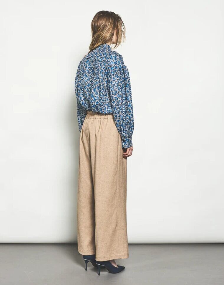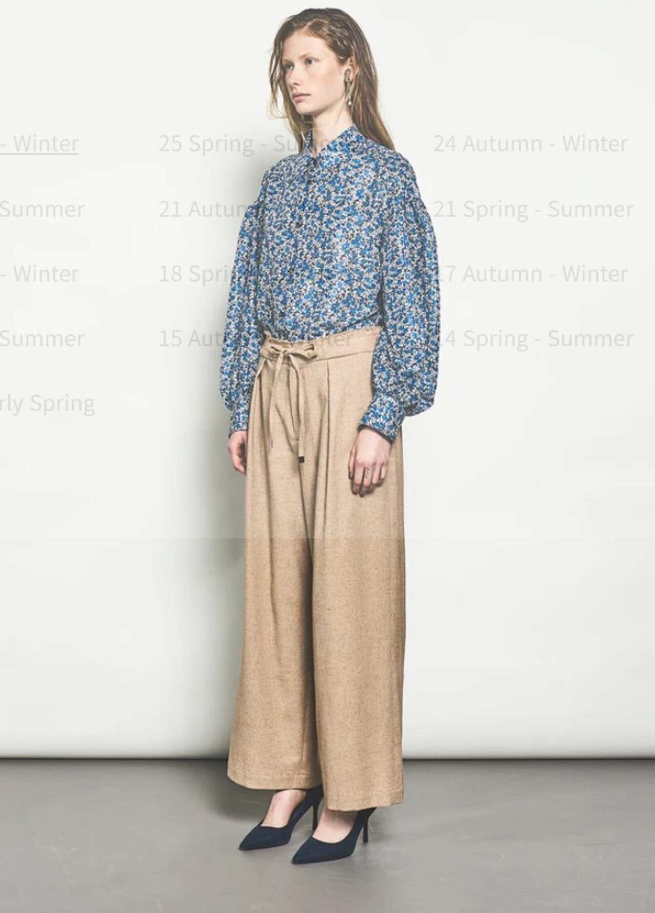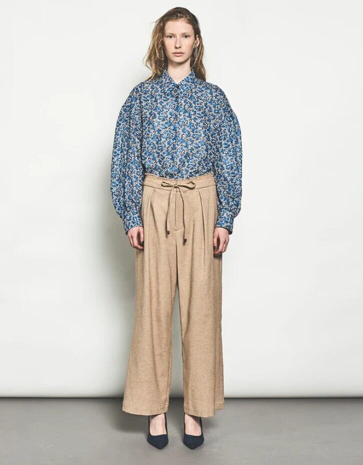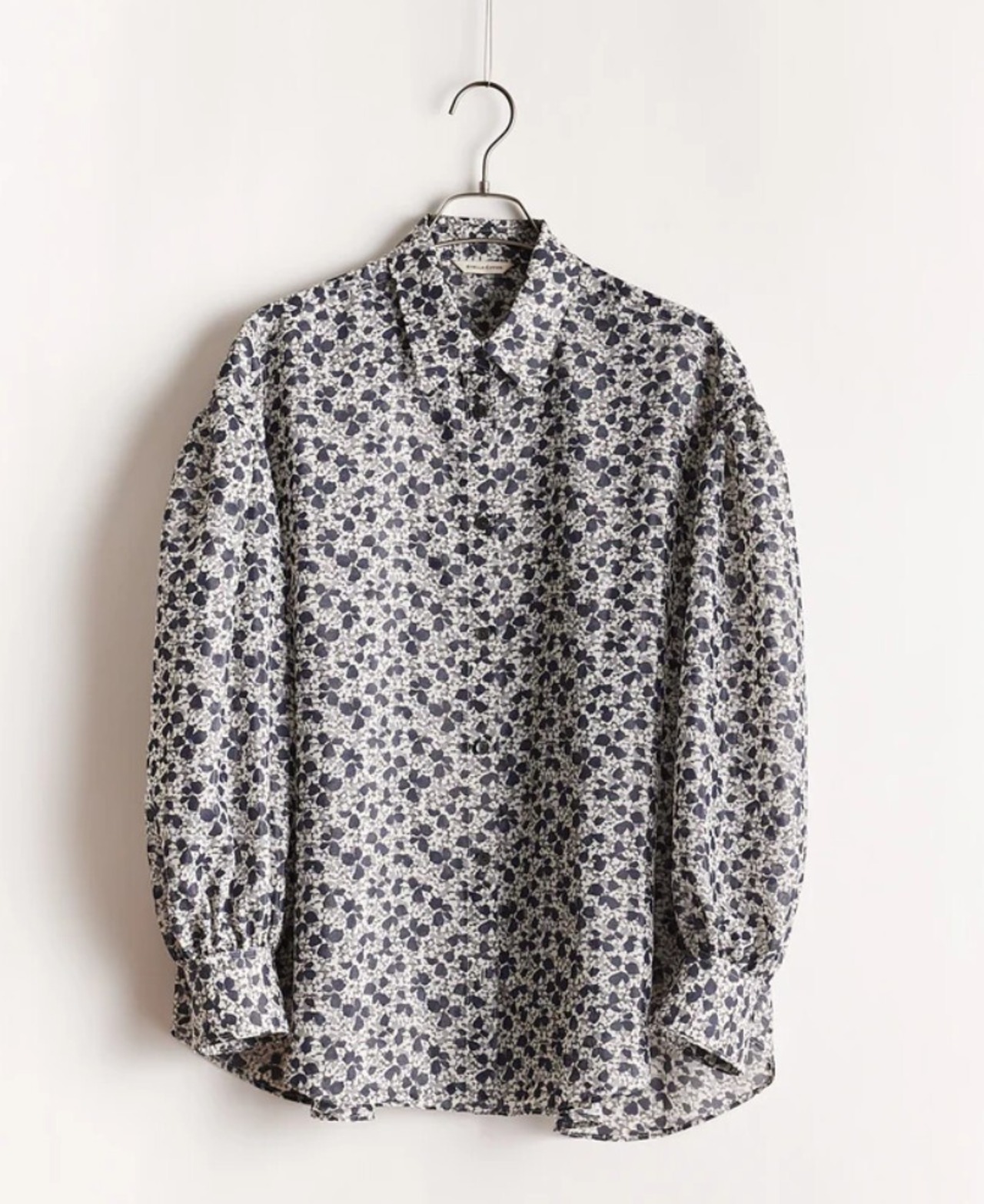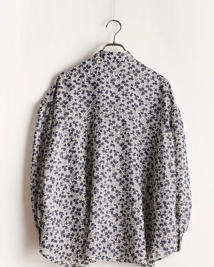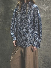 袖のギャザーが特徴的なオーバーサイズのブラウス。透け感と光沢のある柄のブラウスなので、無地のワンピース、無地のインナー×ボトムスの上に羽織ることで定番のアイテムなのにグッとくるアクセントになります。