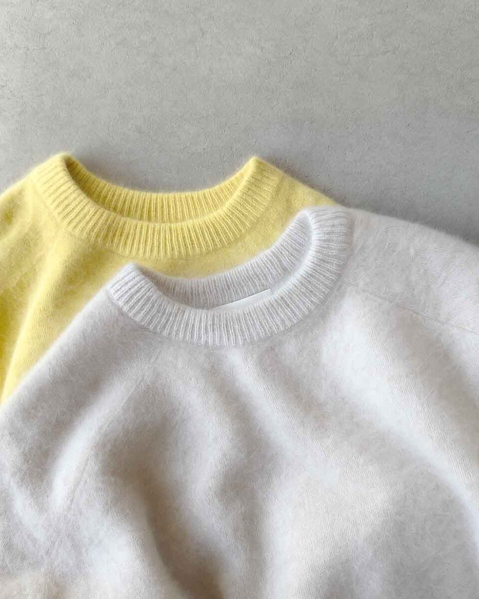 クルーネックにコンパクトめな丈感、少しボリュームのある袖、絶妙なサイズバランスで⼥性らしい丸いフォルムに仕上げました。