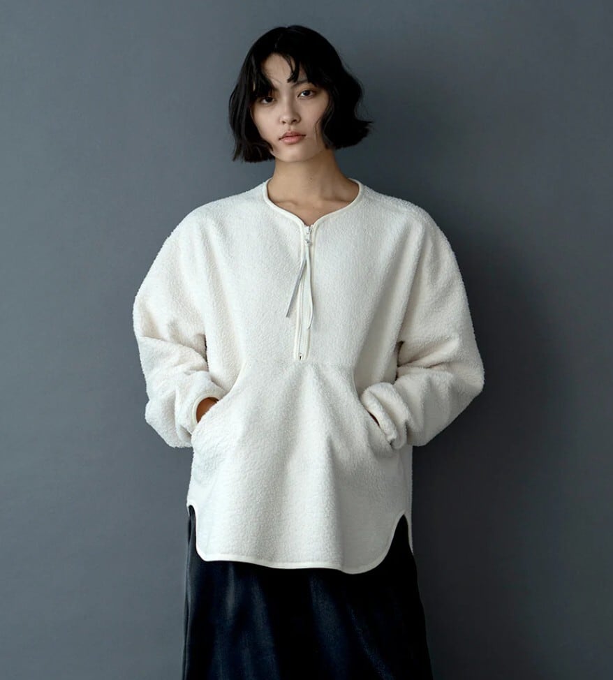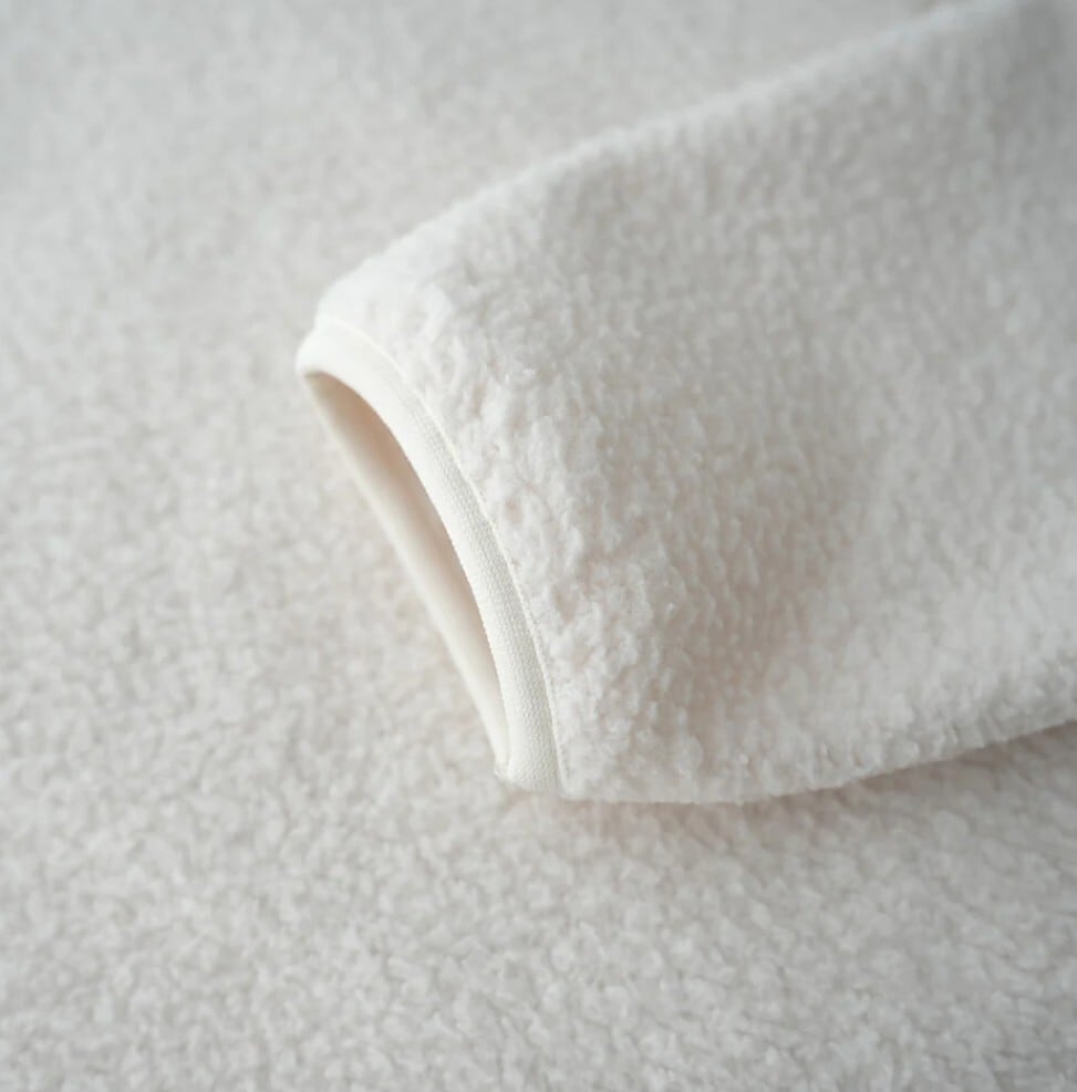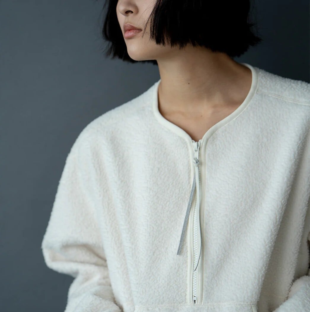 素材は4方向への優れたストレッチ性と撥水性、透湿性を持ち合わせた二重織多機能素材ストームフリース織りの両面ボアです。