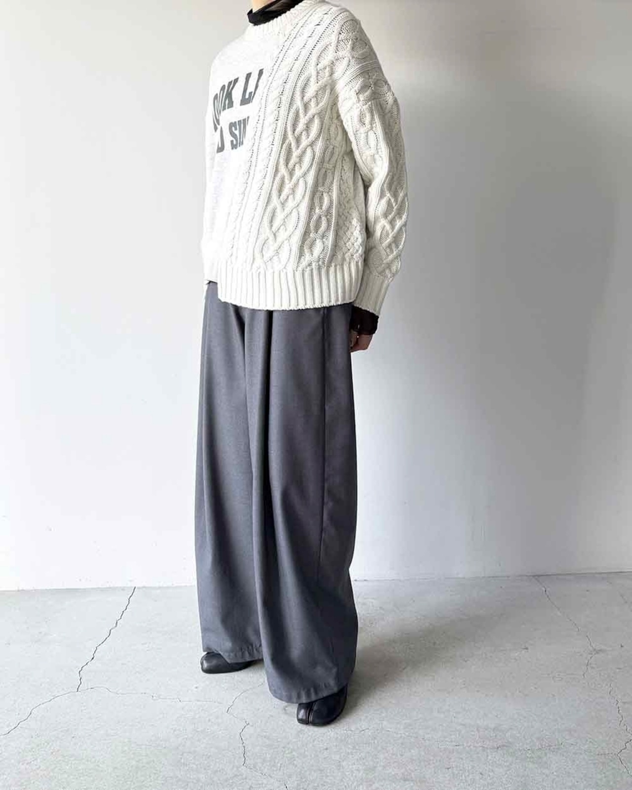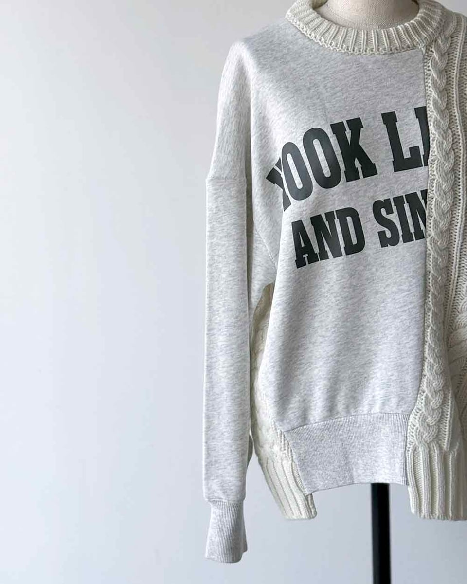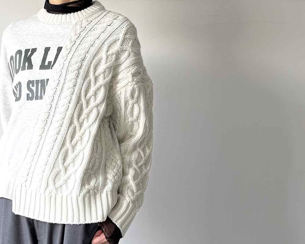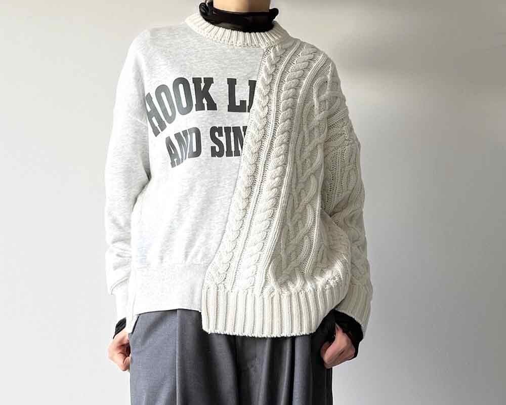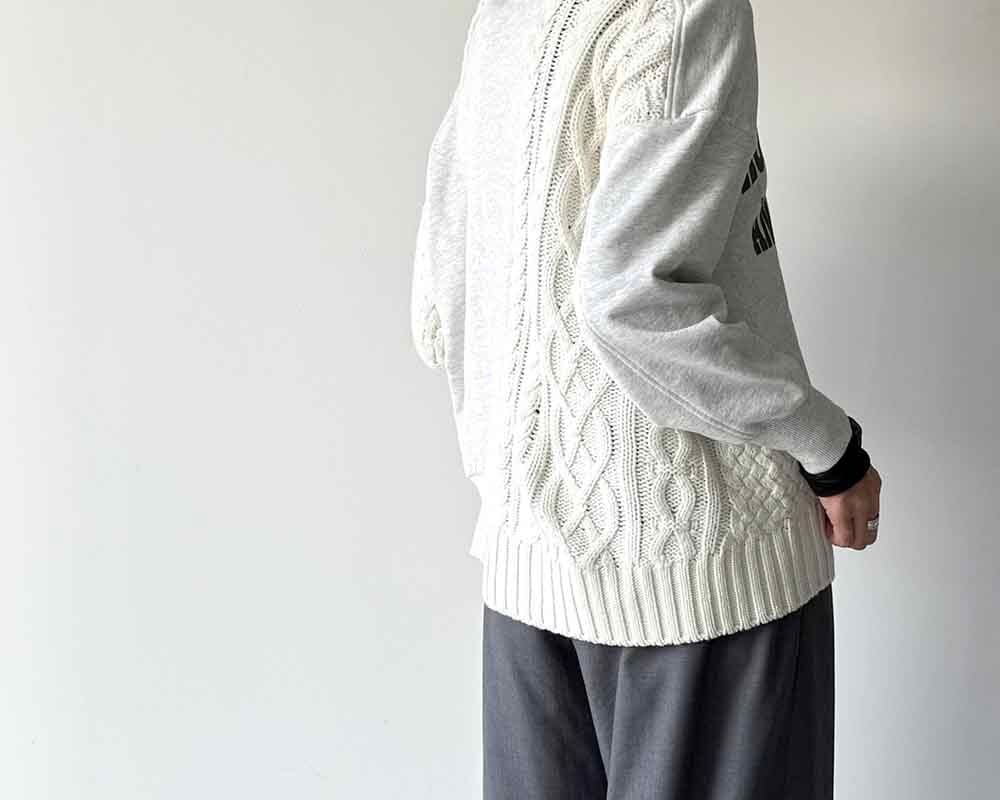 ケーブルニットとロゴスウェットをまるでリメイクしたような、オリジナリティ溢れるデザインに仕上げました。