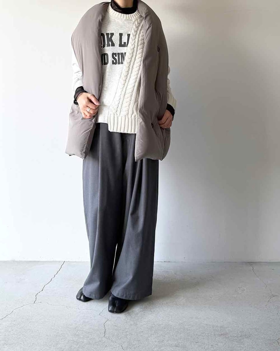 保温性はもちろん、ナイロンの膨らみが加わり、ボリューミーで軽い仕上がりが特徴です。