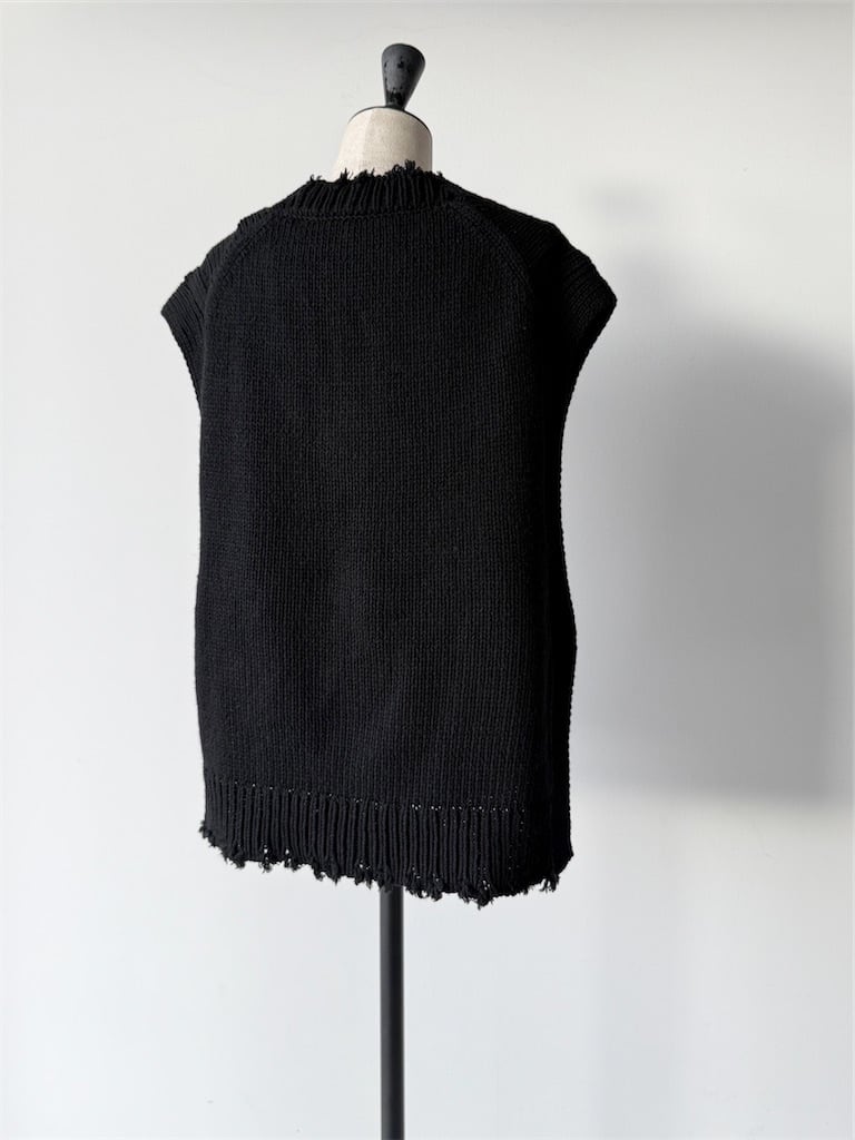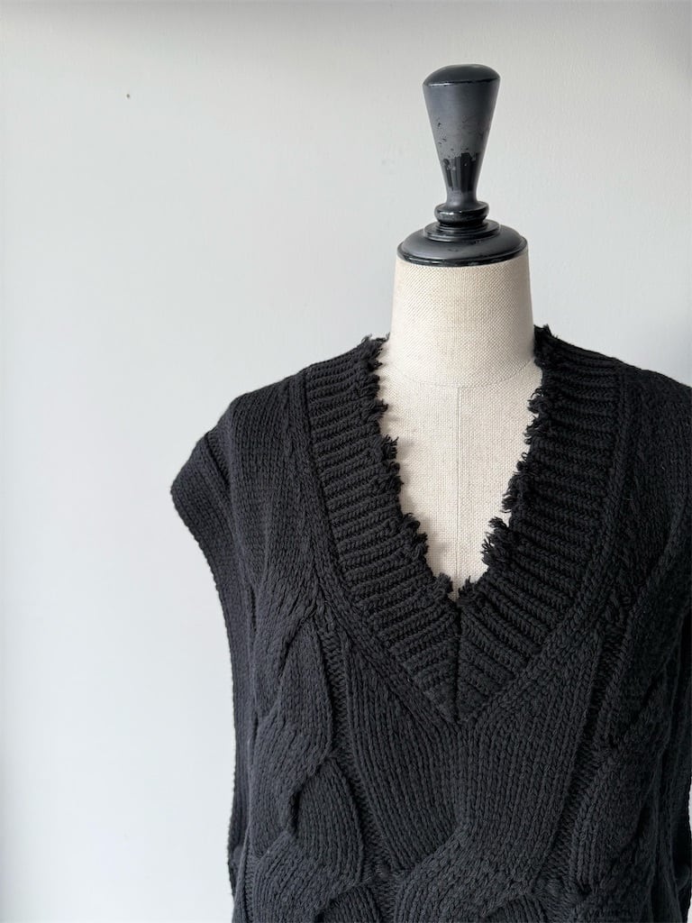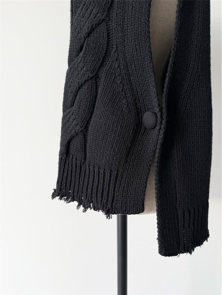 オリジナルのケーブル柄に加えて、襟や裾に切りっぱなしのように見える編地を施し、
