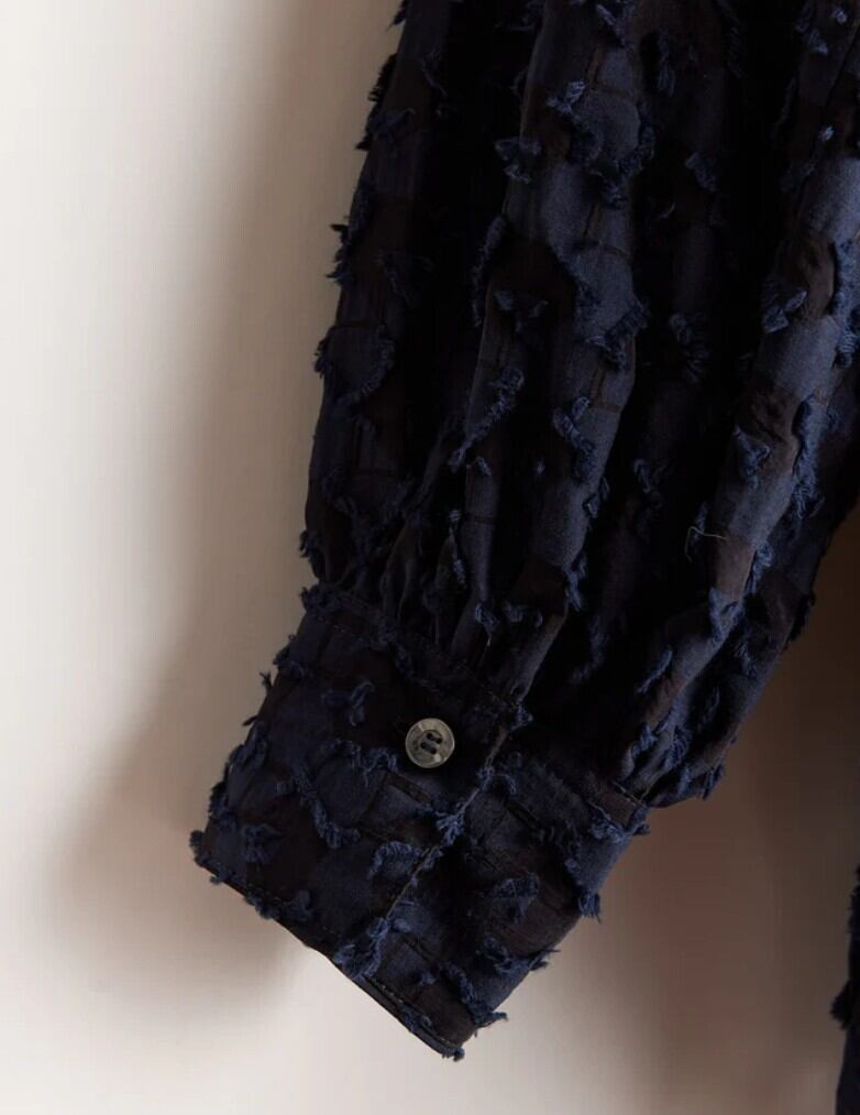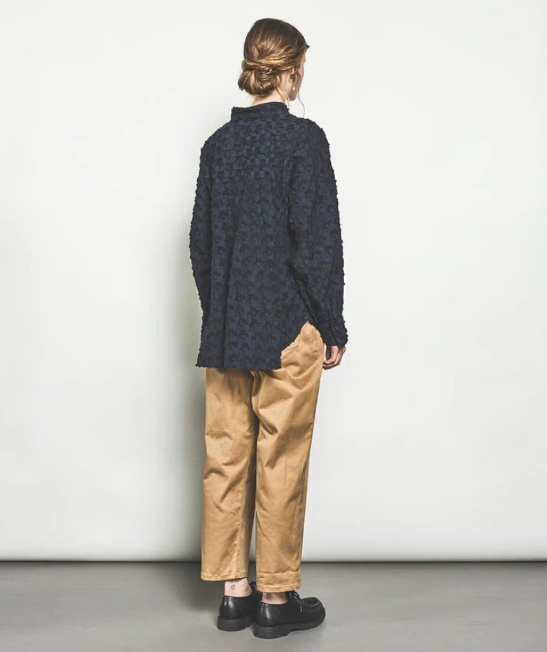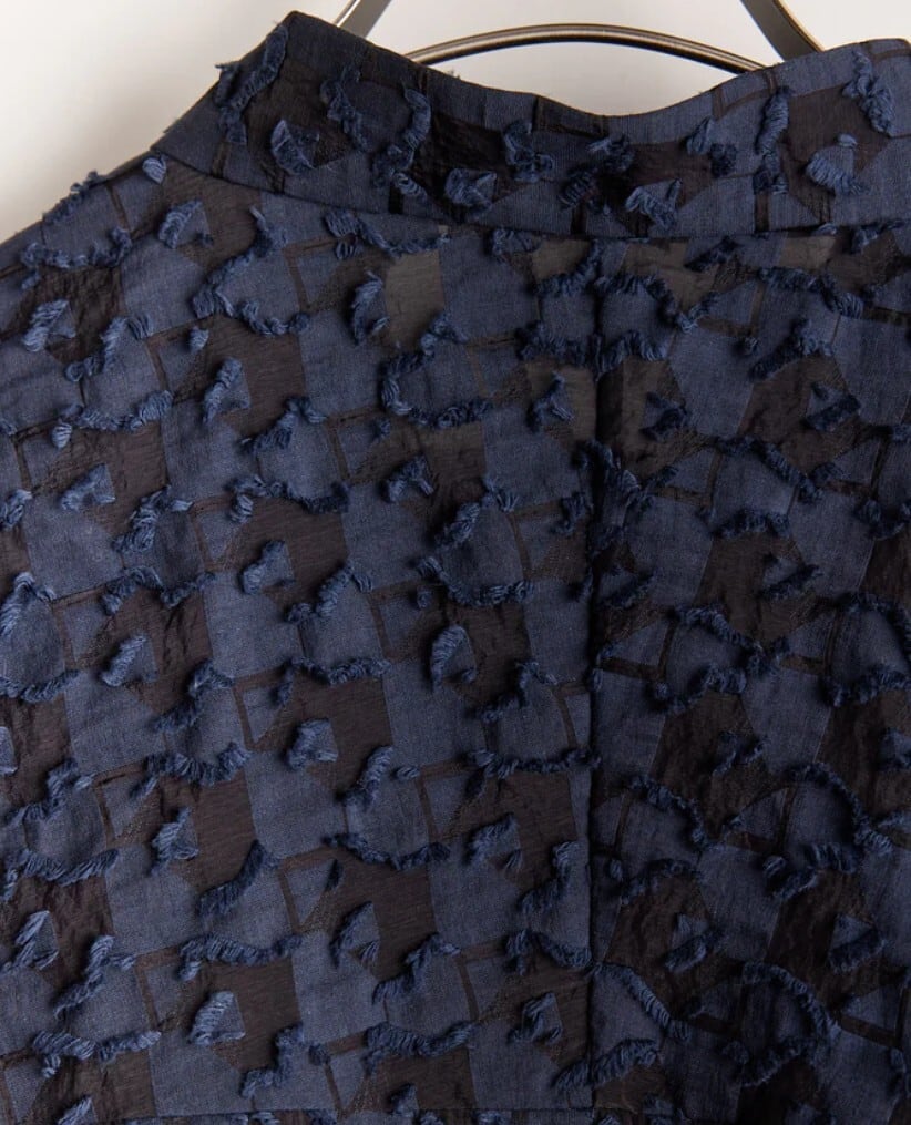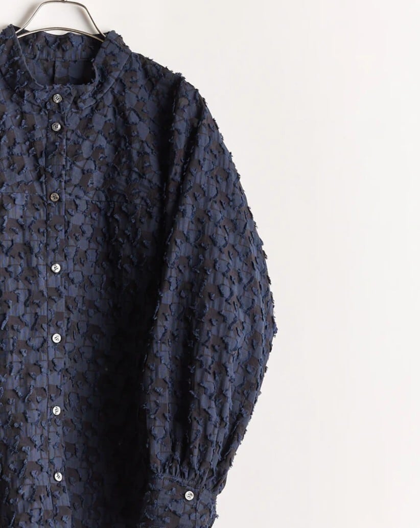 控えめな透け感と立体的な表情がシンプルなバンドカラーのブラウスに奥行きを持たせたデザイン。