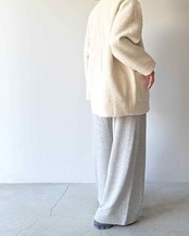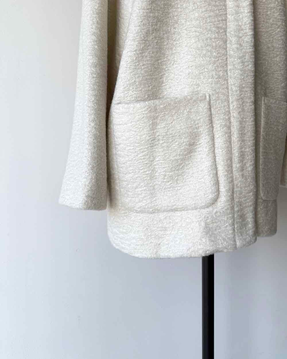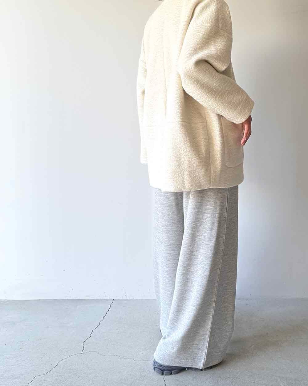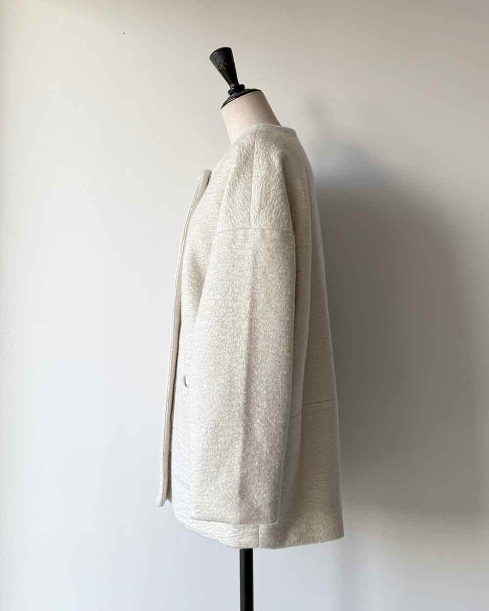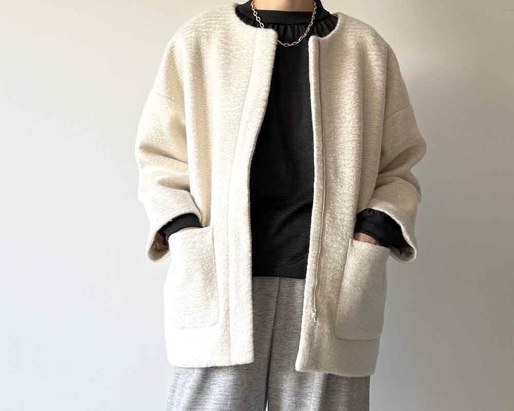 短めの毛足にやさしいカール感を持たせた上質な生地を使用したノーカラーコート。