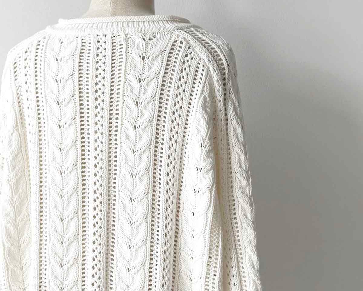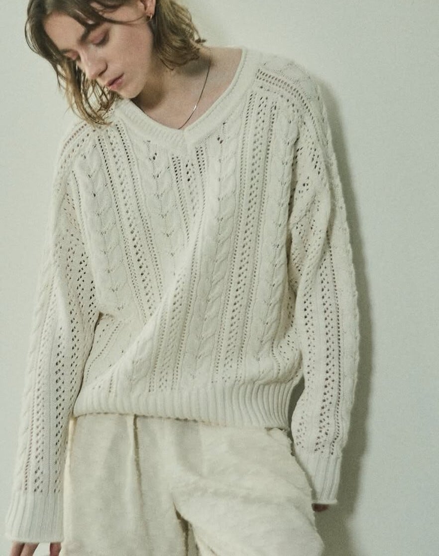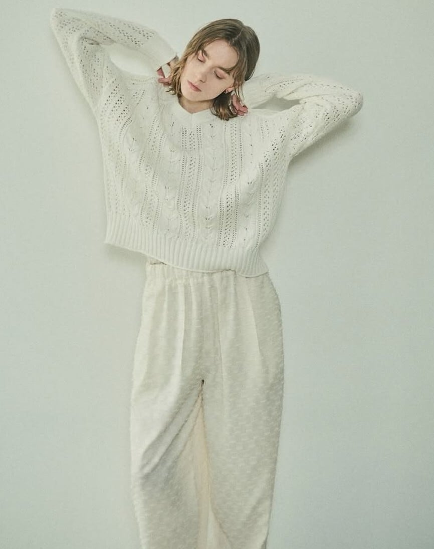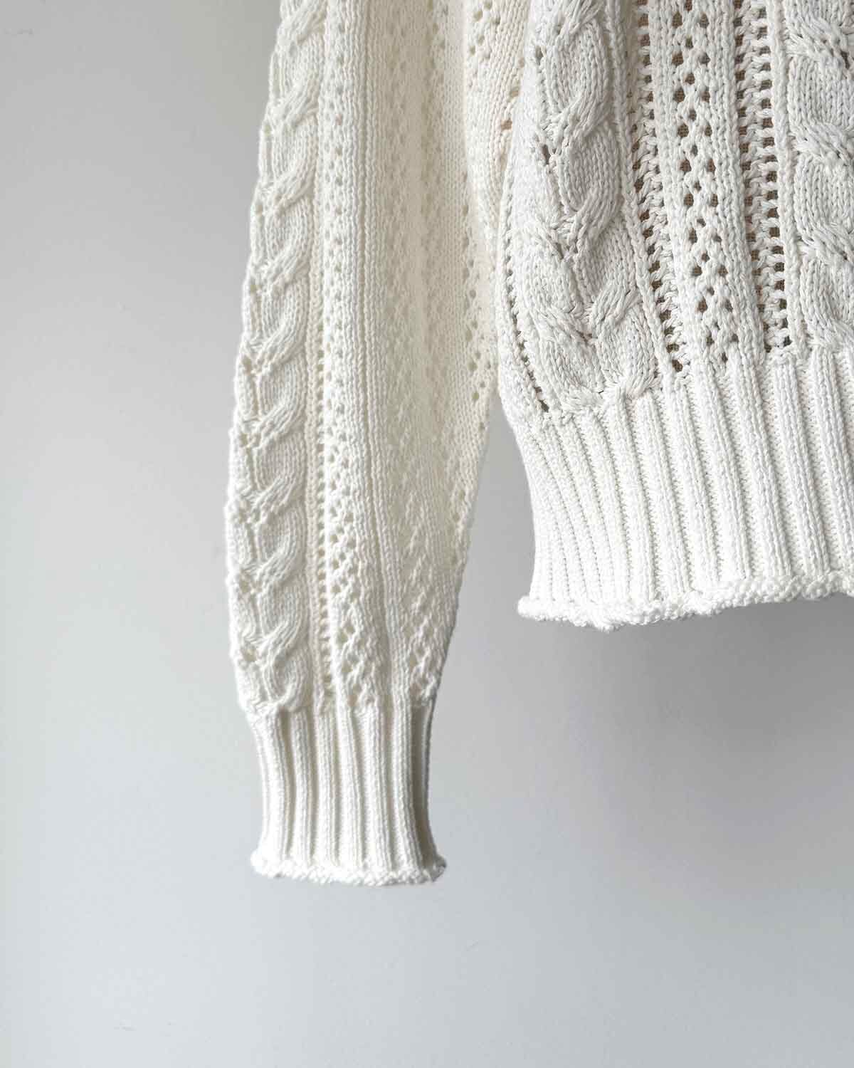 シャリ感のあるコットン糸を使用した、透かしケーブル編みのデザインニット。平らなテープ状になった形状の糸が特徴です。オリジナルの透かしケーブル柄は、着るだけで華やぐ一枚。襟ぐりや袖口、裾がくるんとロールしていたり、細部まで拘りが詰まったデザインもポイントです。体が泳ぐサイジングが、リラックス感のあるシルエットで柔らかい女性らしい印象に。エフォートレスなイージーパンツや、スカート合わせなど、幅広くコーディネートできるアイテムです。