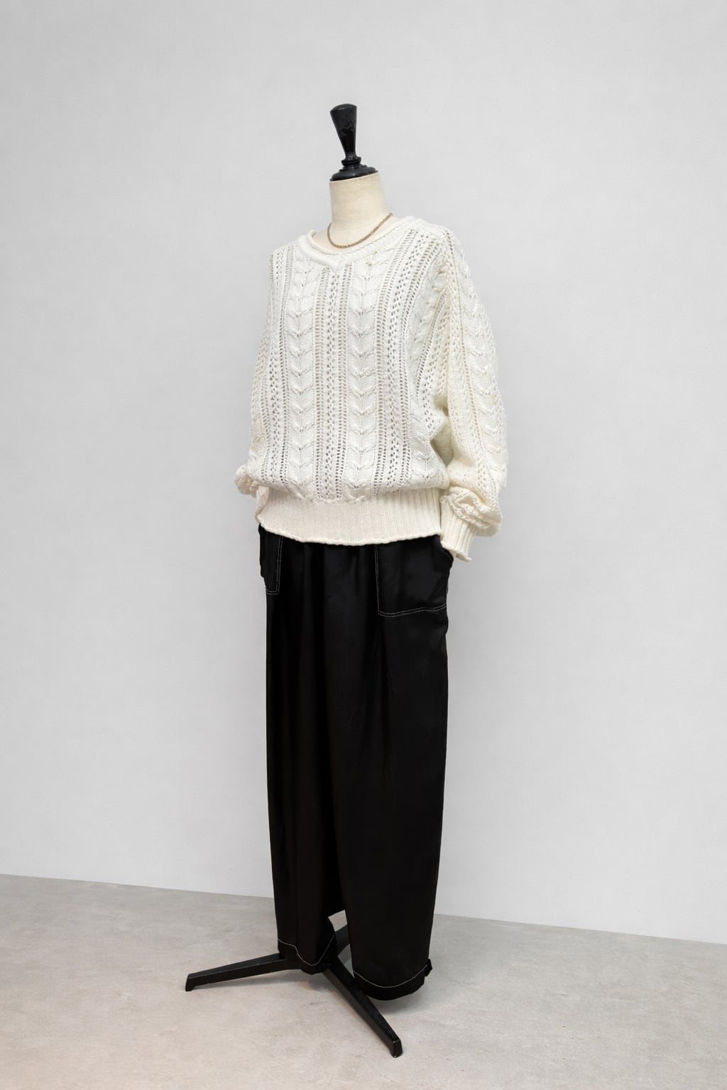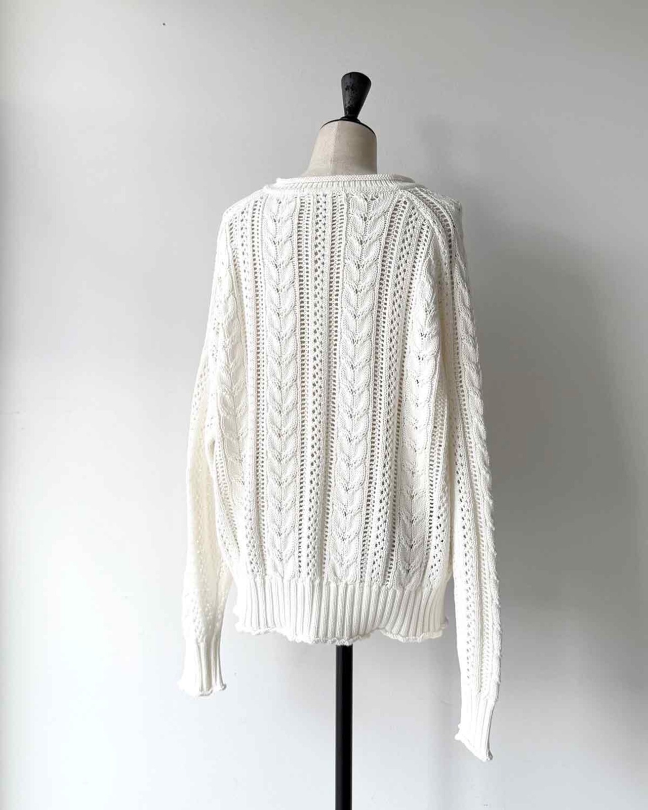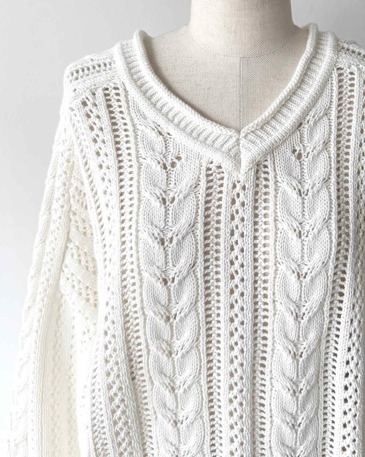 シャリ感のあるコットン糸を使用した、透かしケーブル編みのデザインニット。平らなテープ状になった形状の糸が特徴です。オリジナルの透かしケーブル柄は、着るだけで華やぐ一枚。襟ぐりや袖口、裾がくるんとロールしていたり、細部まで拘りが詰まったデザインもポイントです。体が泳ぐサイジングが、リラックス感のあるシルエットで柔らかい女性らしい印象に。エフォートレスなイージーパンツや、スカート合わせなど、幅広くコーディネートできるアイテムです。