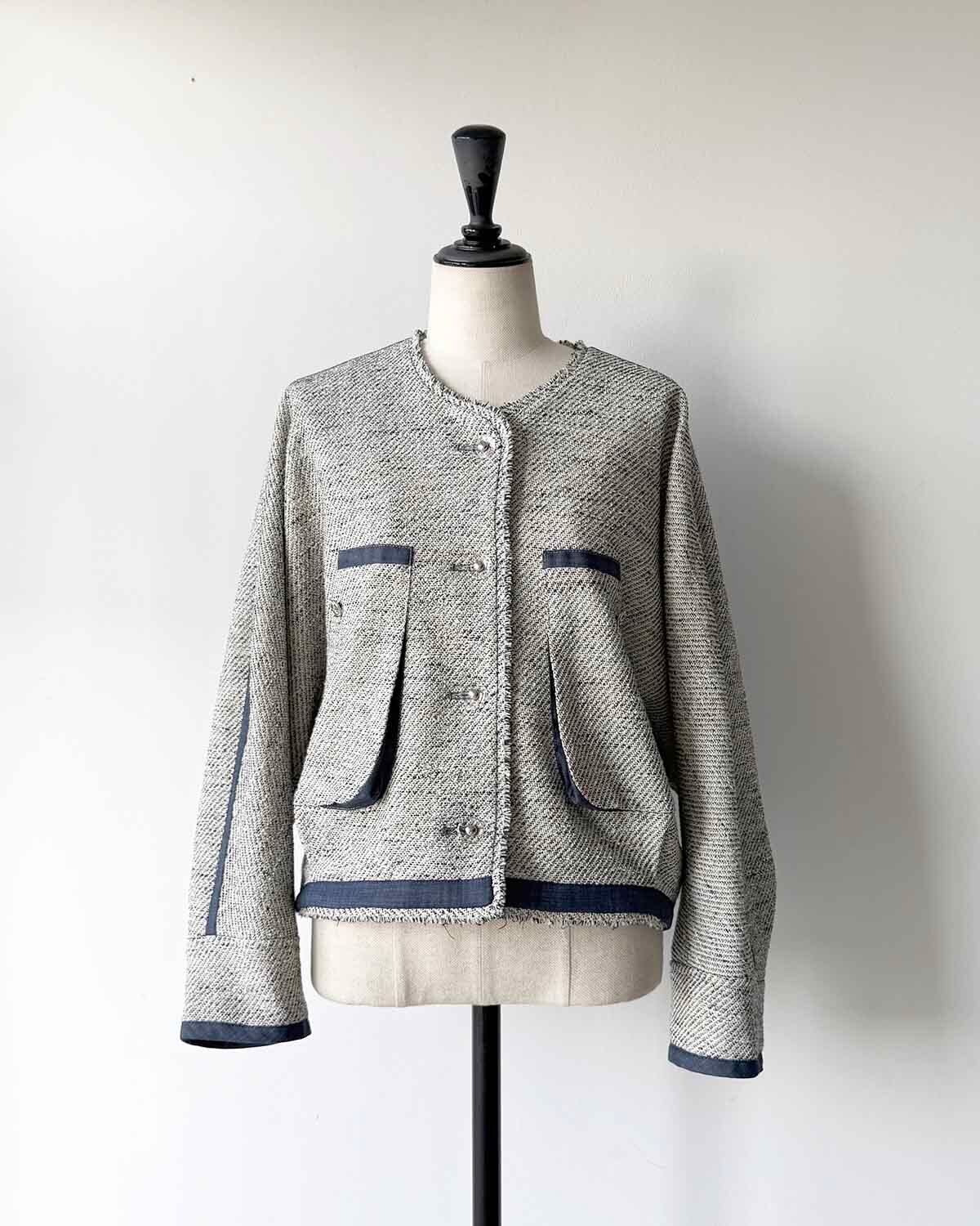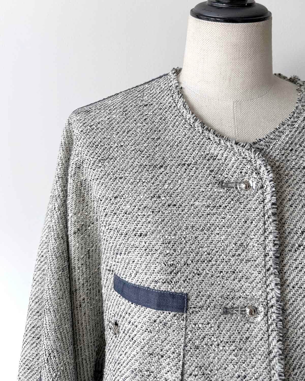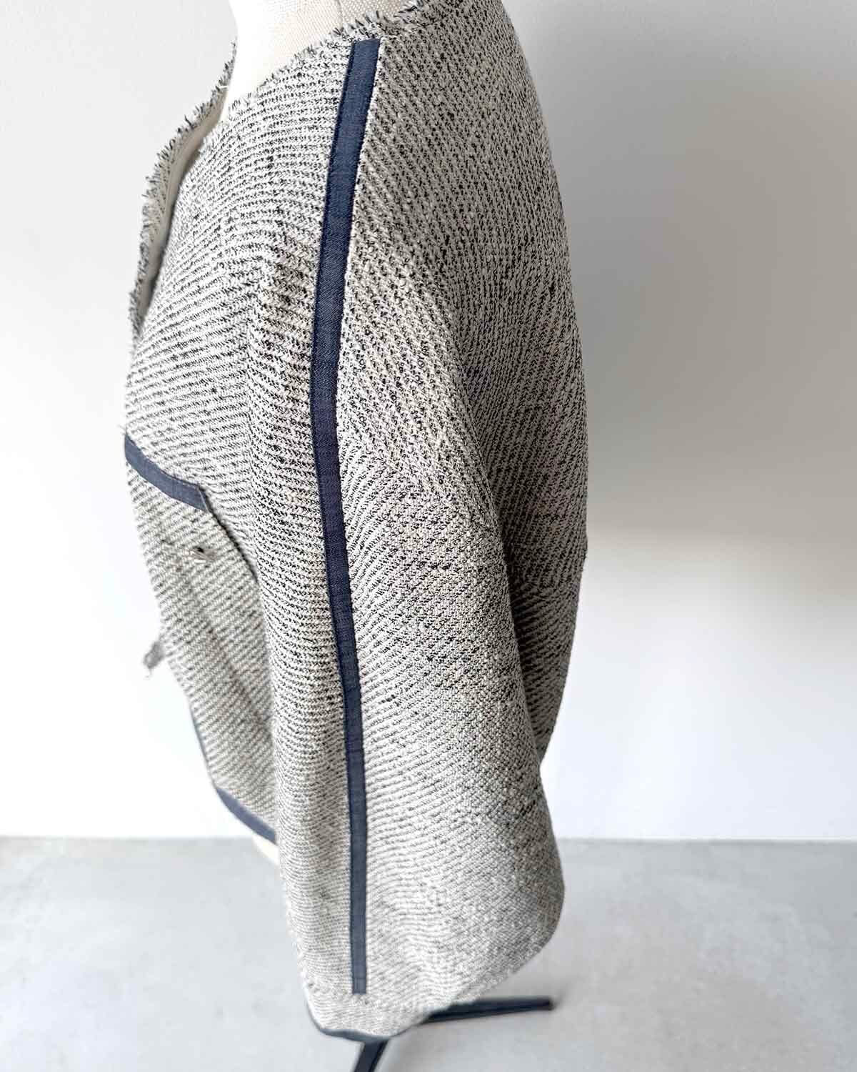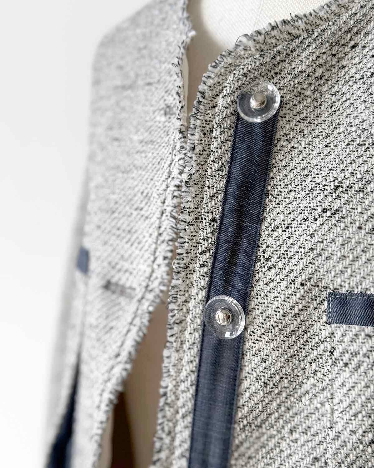 国内有数の毛織物の産地、尾州で丁寧に織り上げられた美しいツイードツイル生地を使用したデザインジャケット。綿やポリエステル、アクリルのスラブ糸が織りなす、上品で涼やかな表情が魅力のツイードです。前身頃から衿ぐりには、生地の耳(セルビッチ)を活かしたフリンジを施し、素材の魅力を最大限に引き出しました。インポートのクリアボタンが透明感のある表情でスタイルにアクセントを添えます。シャンブレー生地をドッキングすることで気負わずに着れるジャケットに仕上がっています。見た目以上に軽い着心地で、カジュアルさとツイードのエレガンスが絶妙に組み合わさり、どんなシーンでも活躍する一着です。