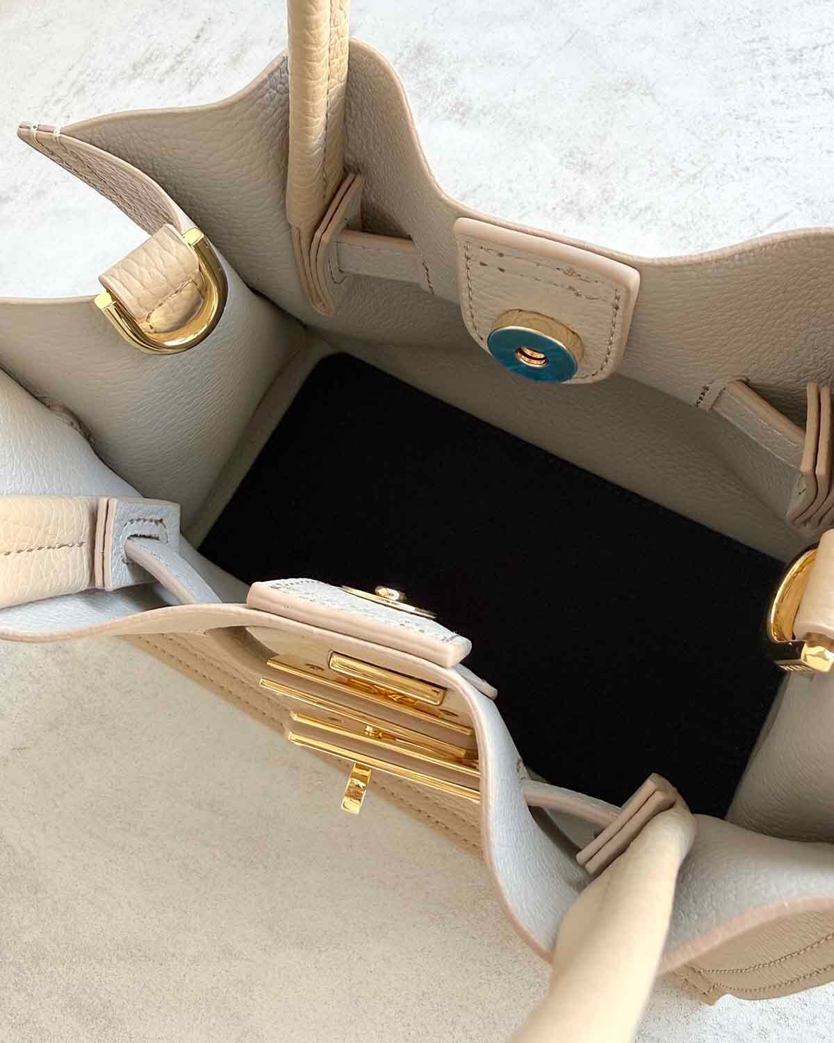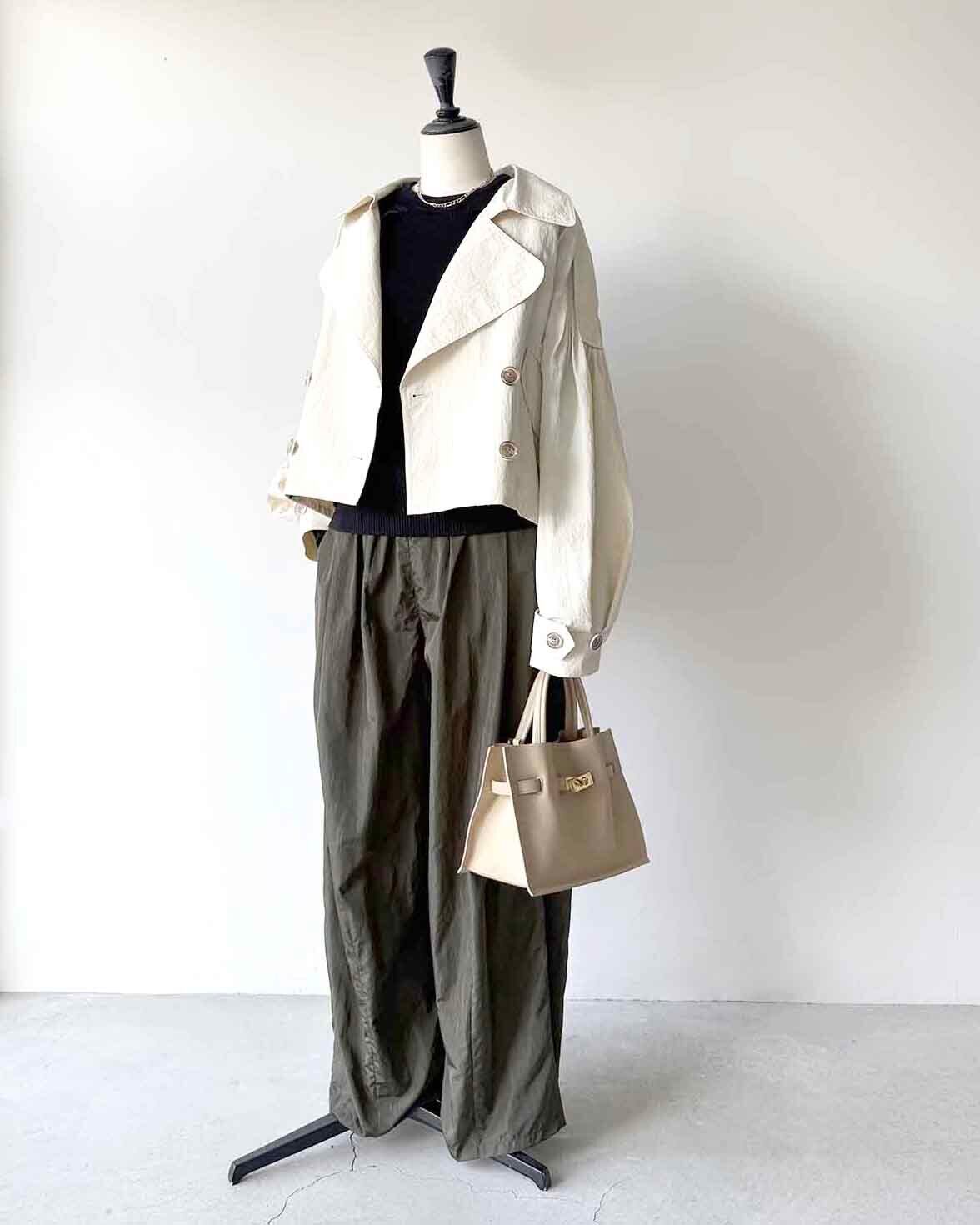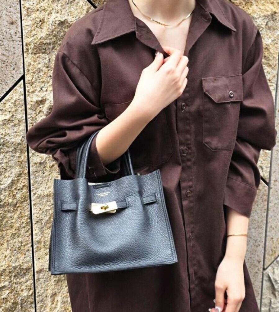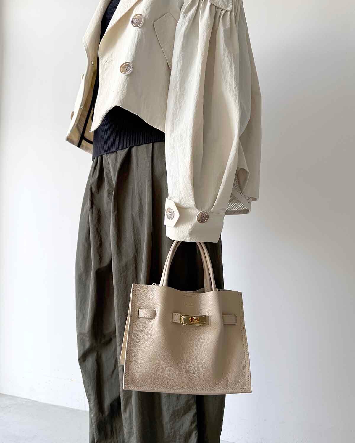 ゴールドの金具やターンロック付きのベルトがアクセントになり、コーディネートを上品な印象に仕上げてくれます。