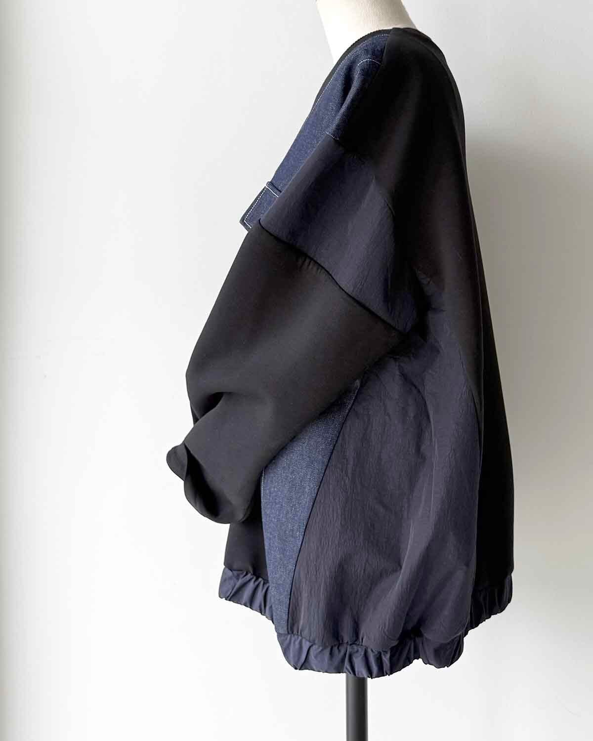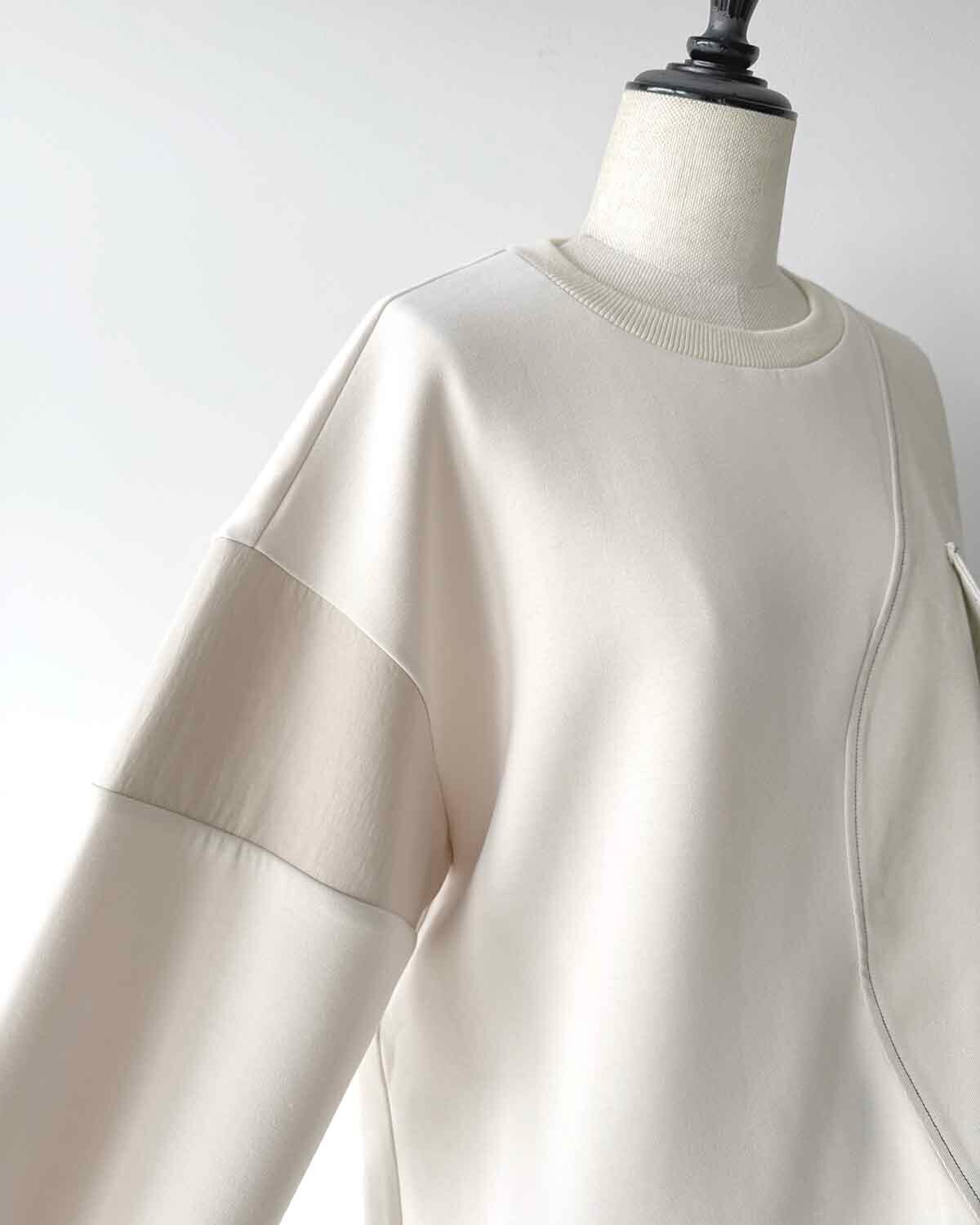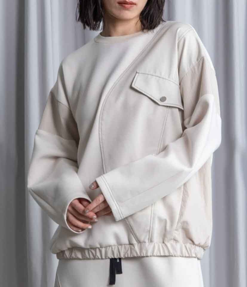 ベーシックなプルオーバーに、アシンメトリーな飾りフラップと異素材の切り替えを加えた、モード感漂う一着。