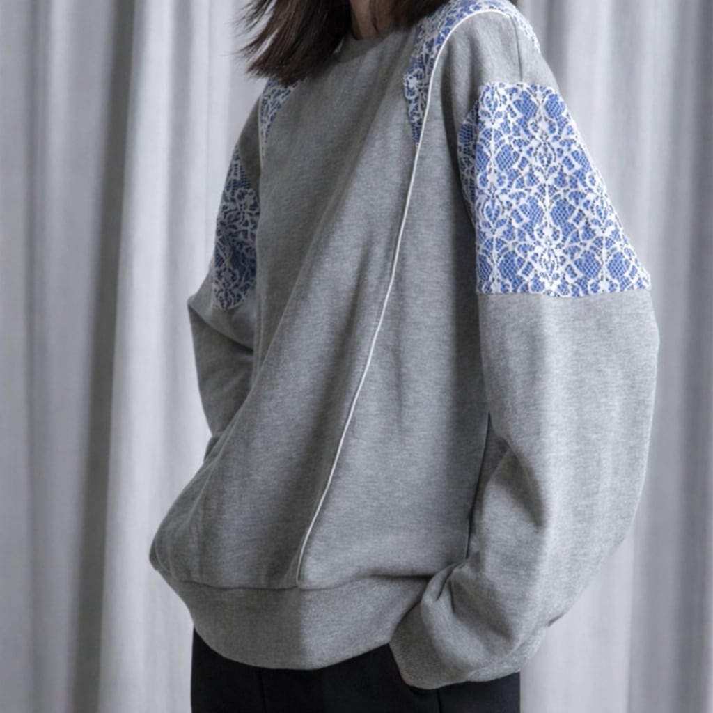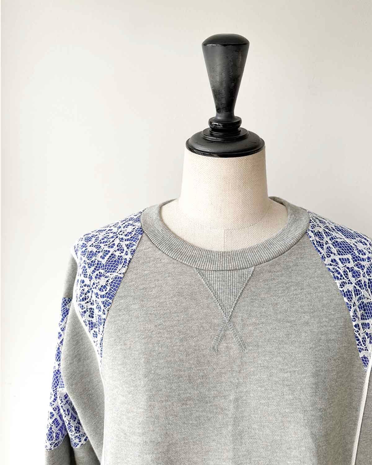 ベーシックなスウェットに、レースを肩や袖に切り替えたデザインが印象的な一枚。
