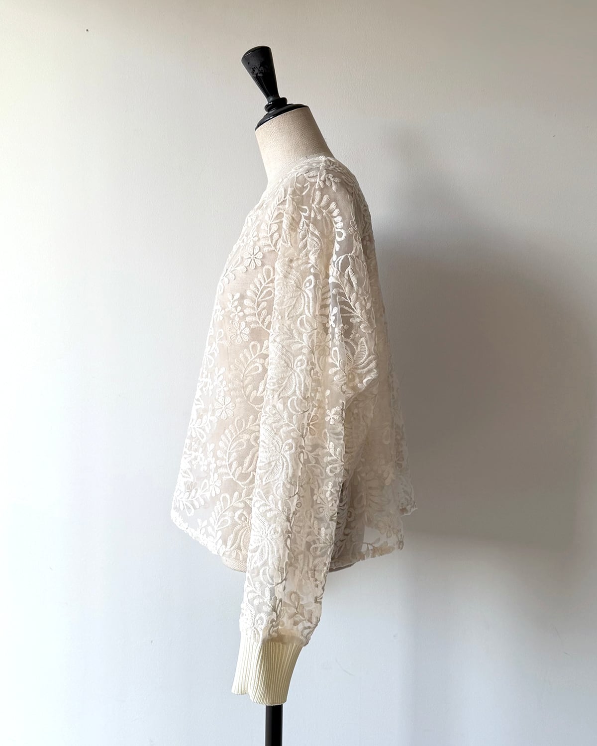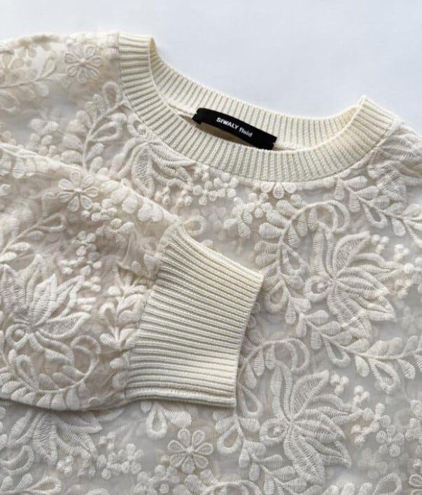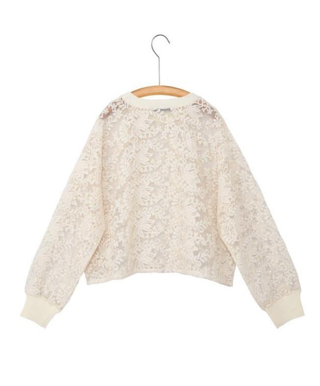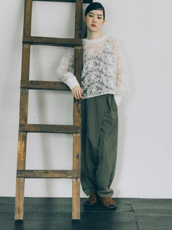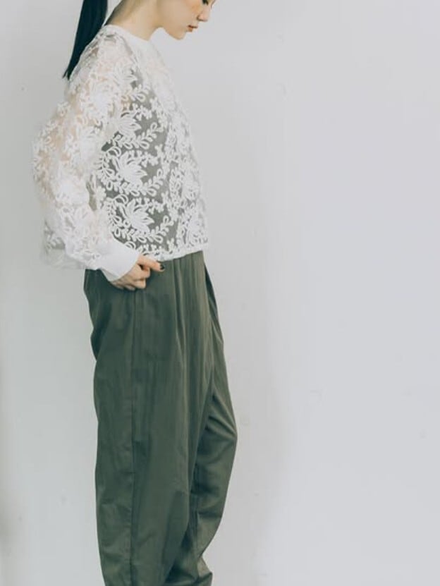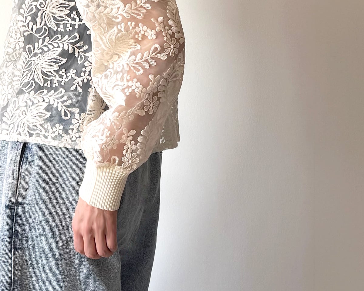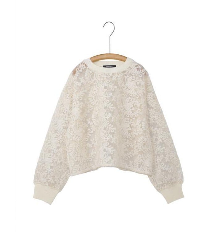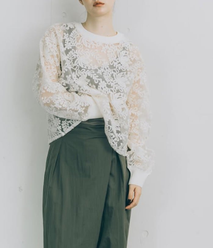 ニットリブ使いの布帛プルオーバー。生成のレース生地は、透け感のあるオーガンジーに施されたコットンの刺繍が目を引きます。襟ぐりと袖口をリブニットで仕上げ、カットソーのように着用できるシンプルできれいめのプルオーバー。短めの丈感がポイントです。