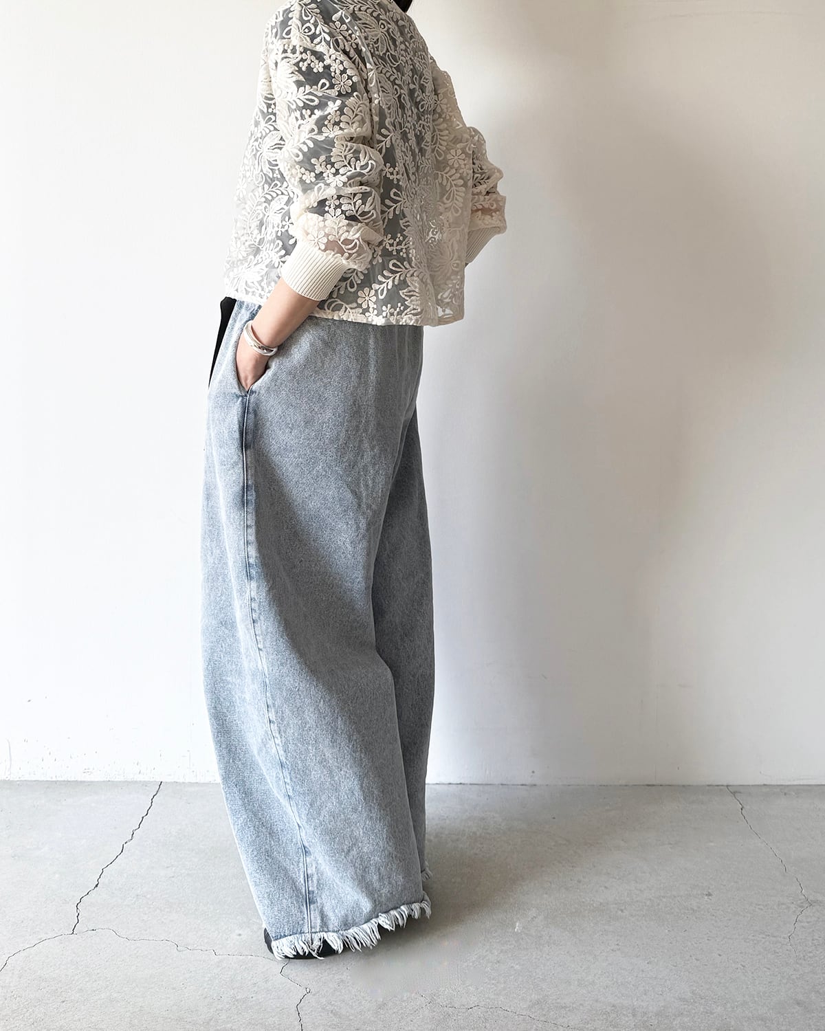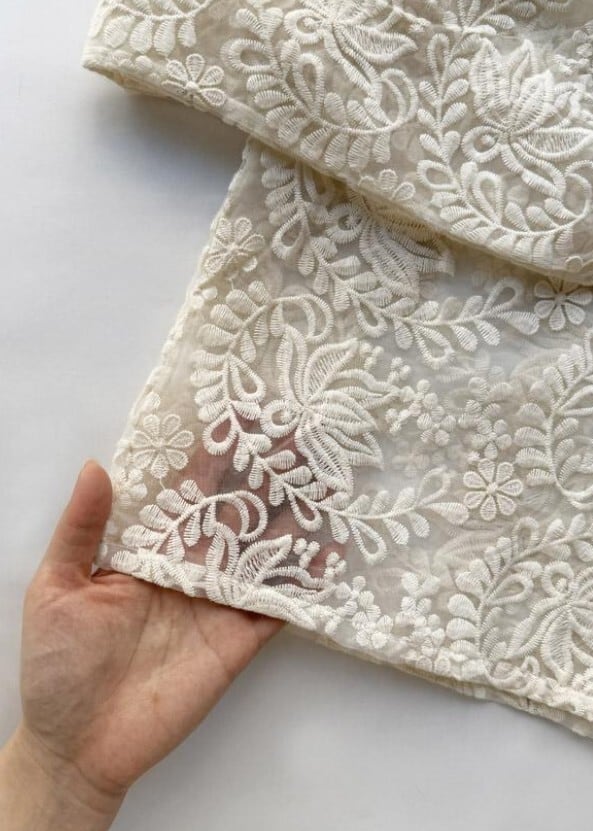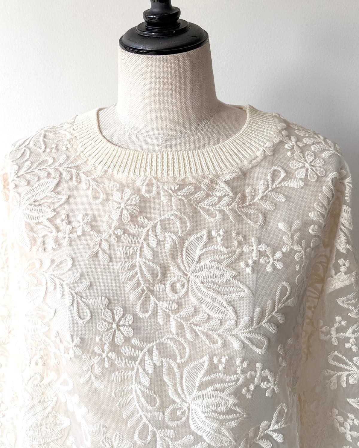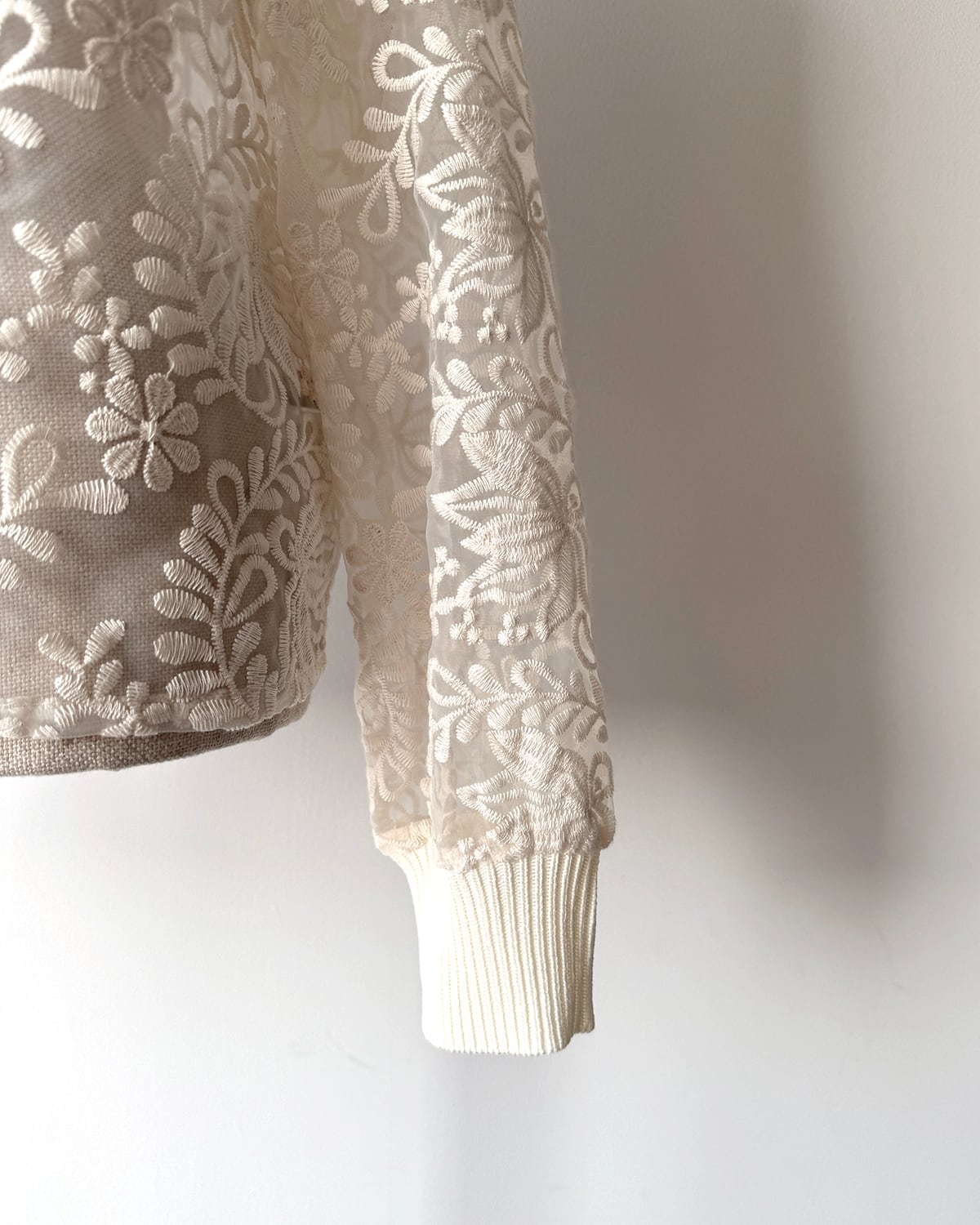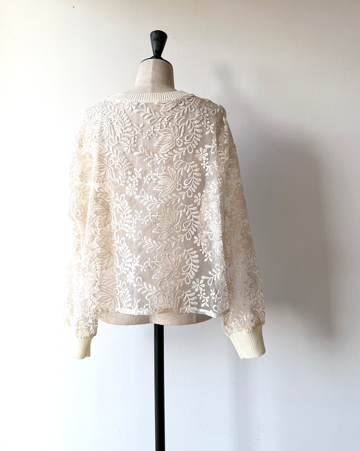 ニットリブ使いの布帛プルオーバー。生成のレース生地は、透け感のあるオーガンジーに施されたコットンの刺繍が目を引きます。襟ぐりと袖口をリブニットで仕上げ、カットソーのように着用できるシンプルできれいめのプルオーバー。短めの丈感がポイントです。