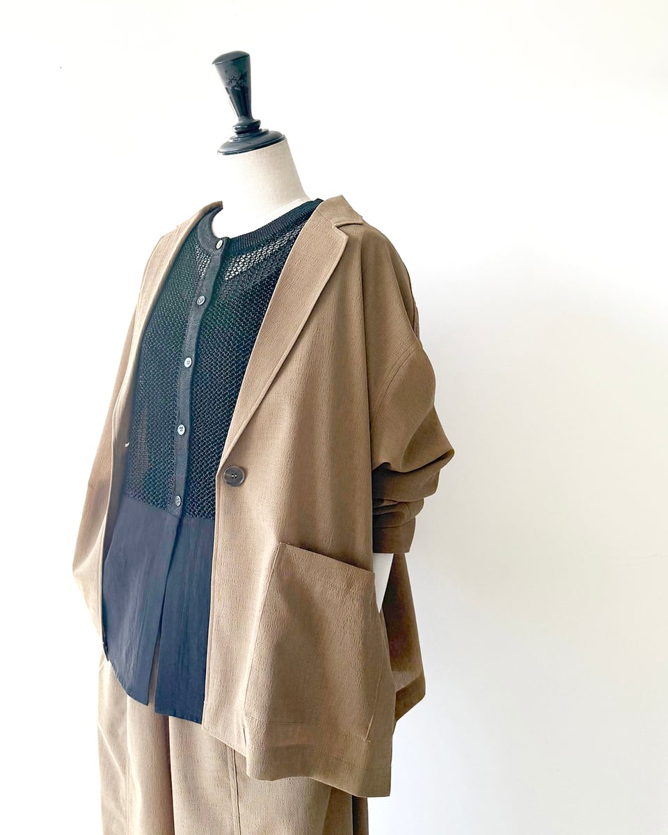 前あきはテーラードですが、後ろヨークに袖のカフス切替やタックなどのシャツディテールを加えて、軽快な印象を与える肩の凝らないジャケットに仕上げています。