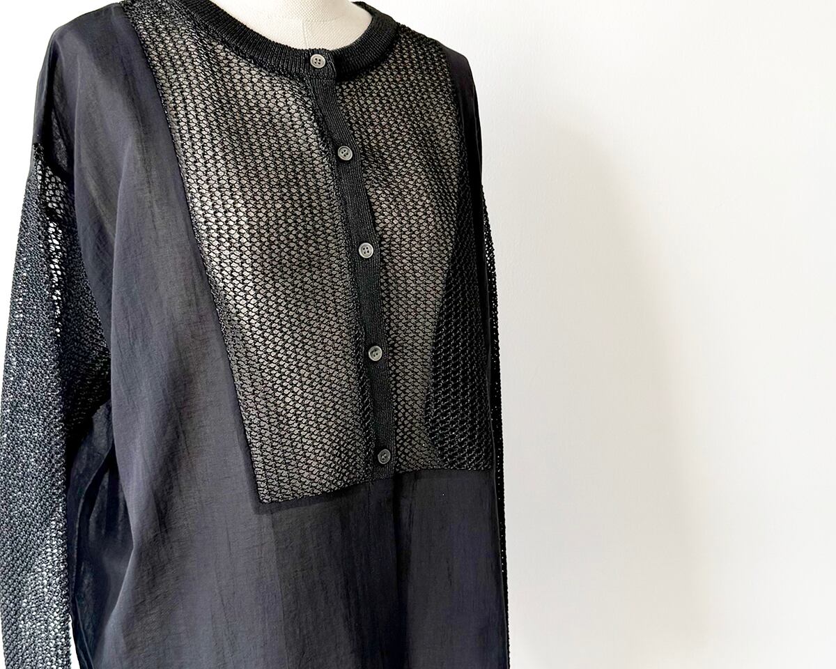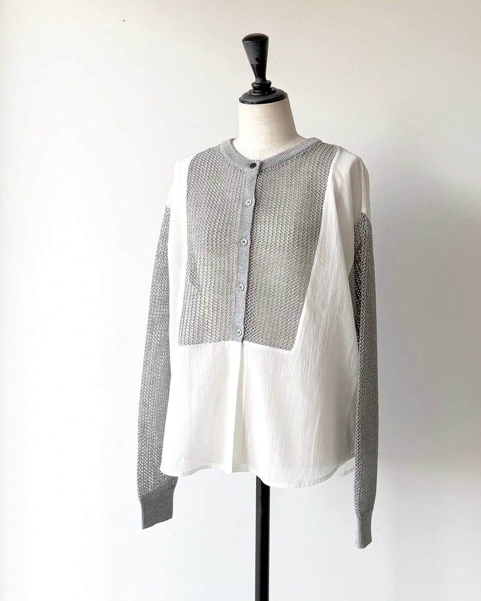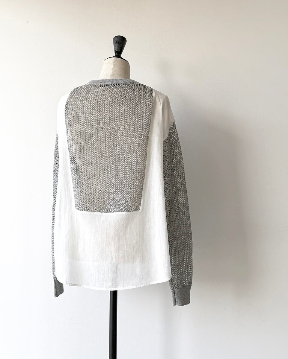 イカ胸部分を囲う様にカッティングされたブラウス地がポイントで、ニット部分のスカスカな編地とのコントラストが楽しい1枚。