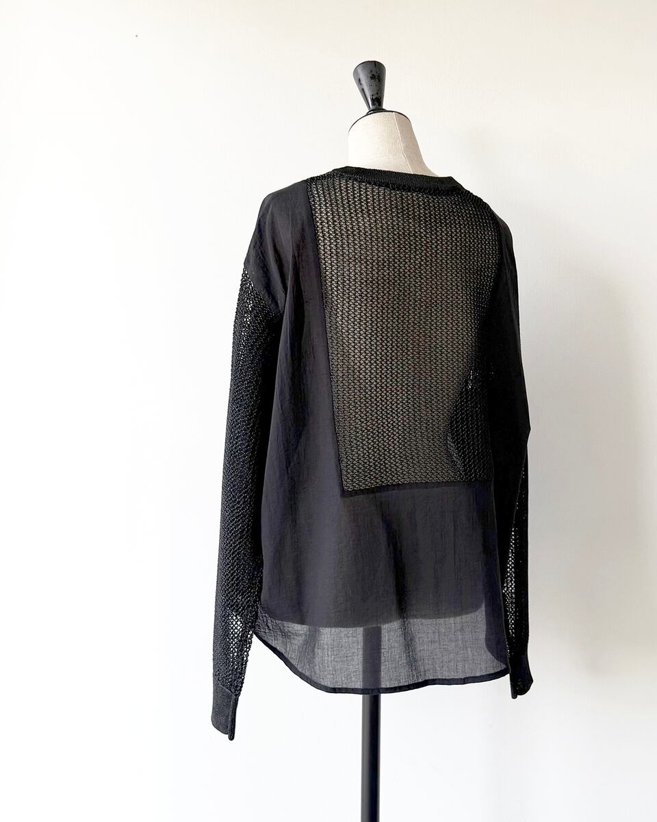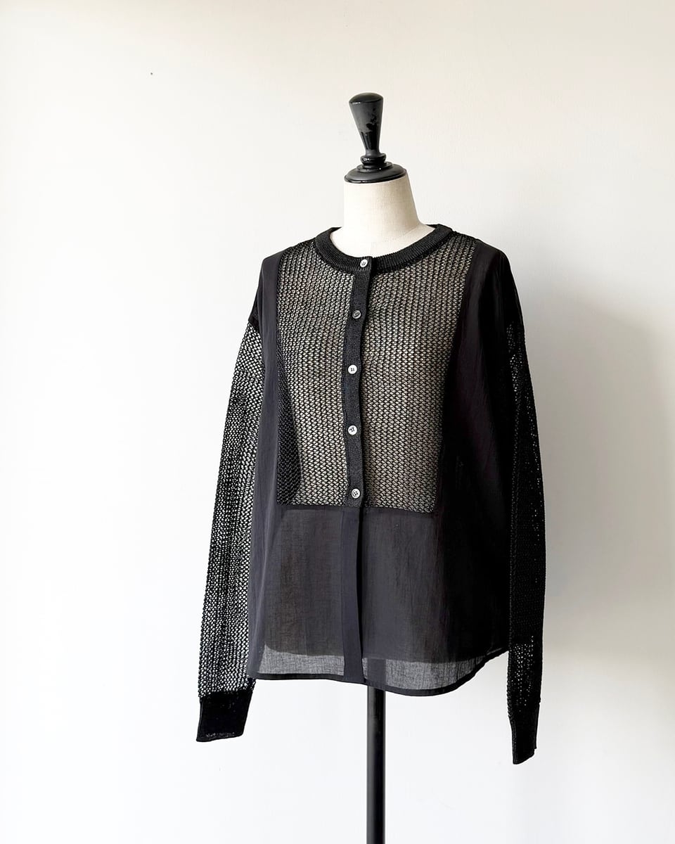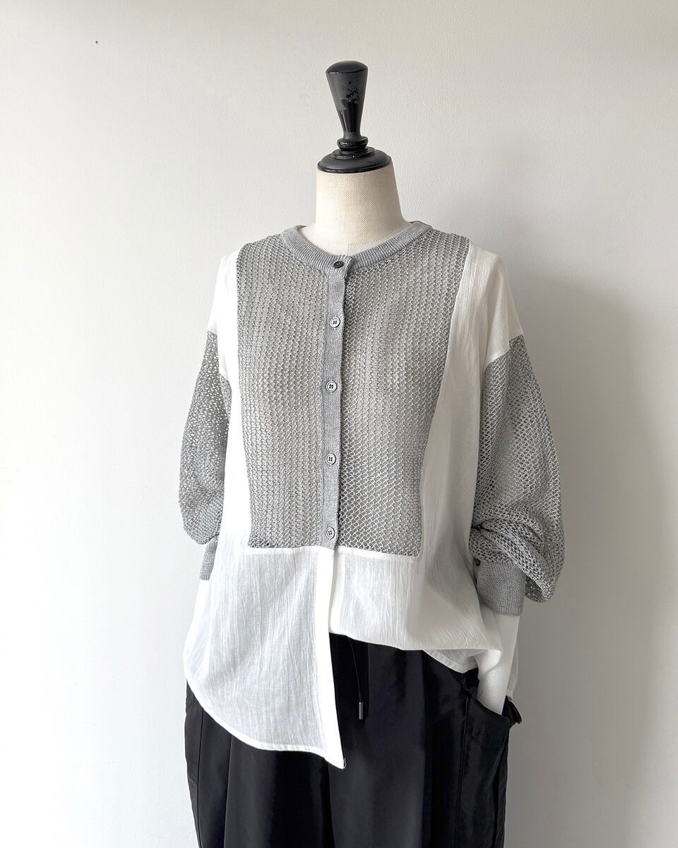 イカ胸部分を囲う様にカッティングされたブラウス地がポイントで、ニット部分のスカスカな編地とのコントラストが楽しい1枚。
