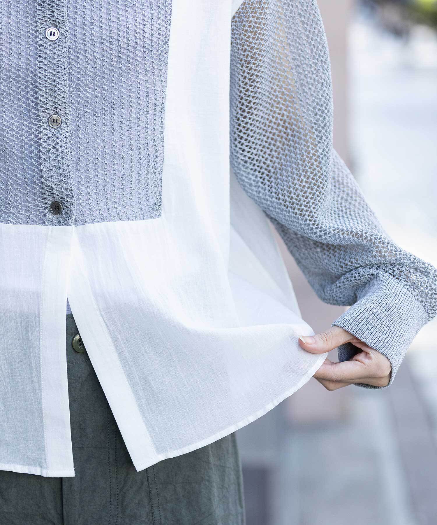 涼し気なスカシ編みとナチュラルな風合いのコットンボイルで、繊細かつ軽やかに仕上げたドッキングブラウス。