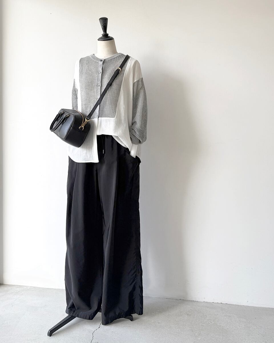ブラック/ブラックのボディにシアー素材が重なることで、モード感と抜け感が共存する配色