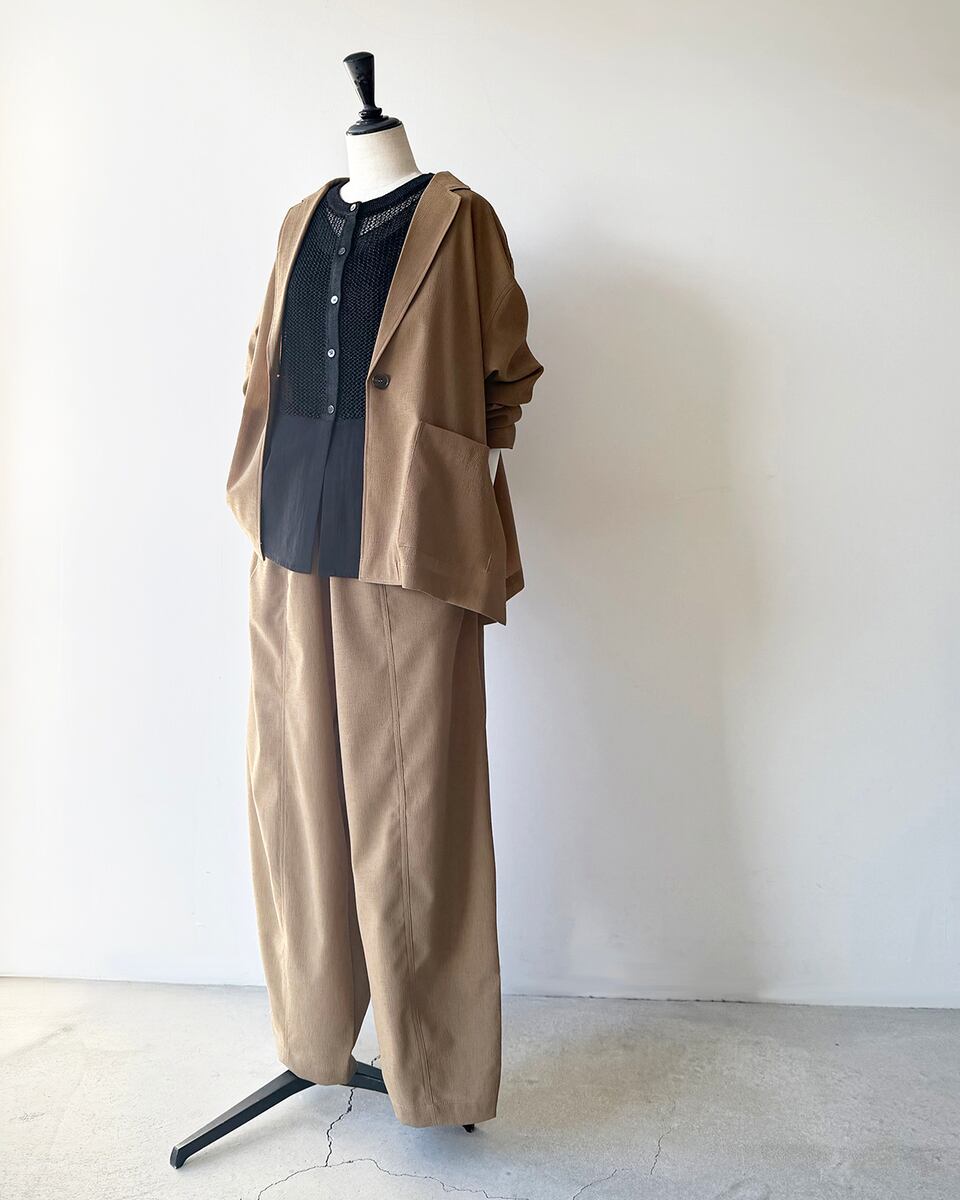 リネンの様なカラっとした質感を持ち合わせつつ、リネンの弱点でもある飛び込みや、水洗いで変形することもないので、真夏まで気を使わずに着用出来るのが特徴です。